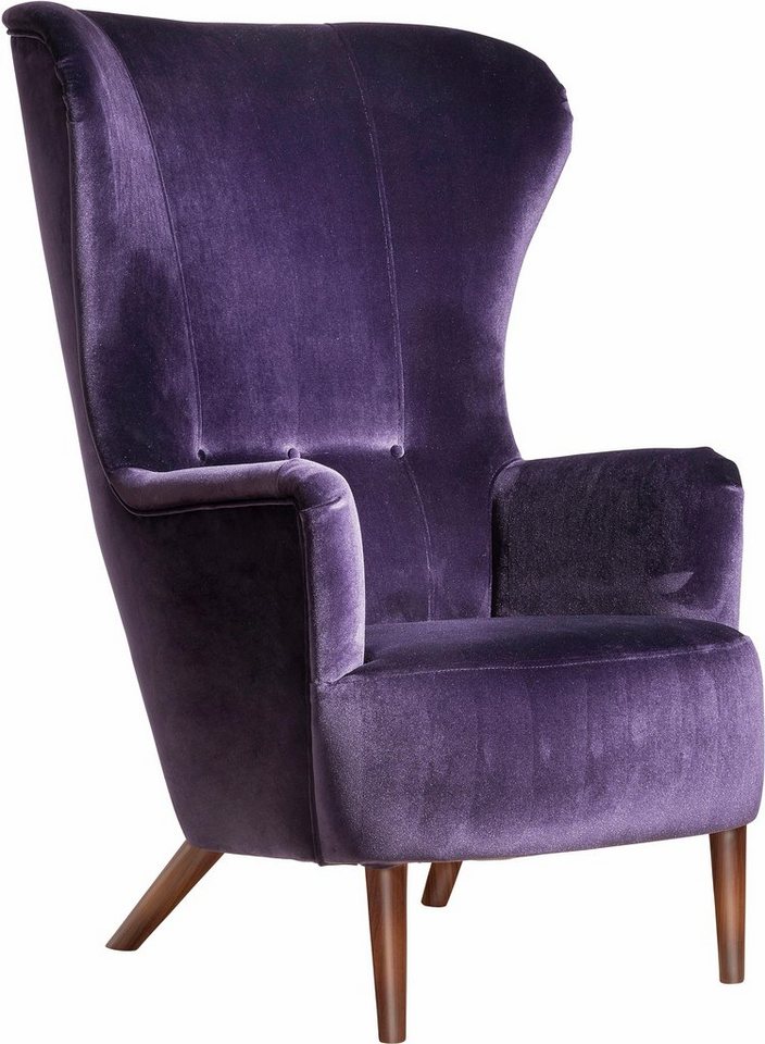 Gemütlicher Retro-Hochlehnsessel »Liana« von Max Winzer® im weichen Samtvelours. Die schmalen Armlehnen und die edle Knopfheftung im Rücken verleihen dem Sessel »Liana« eine elegante Optik. Das hohe Rückenteil ist seitlich gewölbt und an die Optik eines klassischen Ohrenbackensessels angelehnt. Damit verbindet »Liana« Sitzkomfort und elegantes Retro-Design. Die Sitzpolsterung ist mittelfest, die Füße sind nussbaumfarben dunkel lackiert. Die Rückseite ist mit Originalstoff bezogen, somit ist der Max Winzer® Hochlehner Sessel »Liana« frei im Raum stellbar.