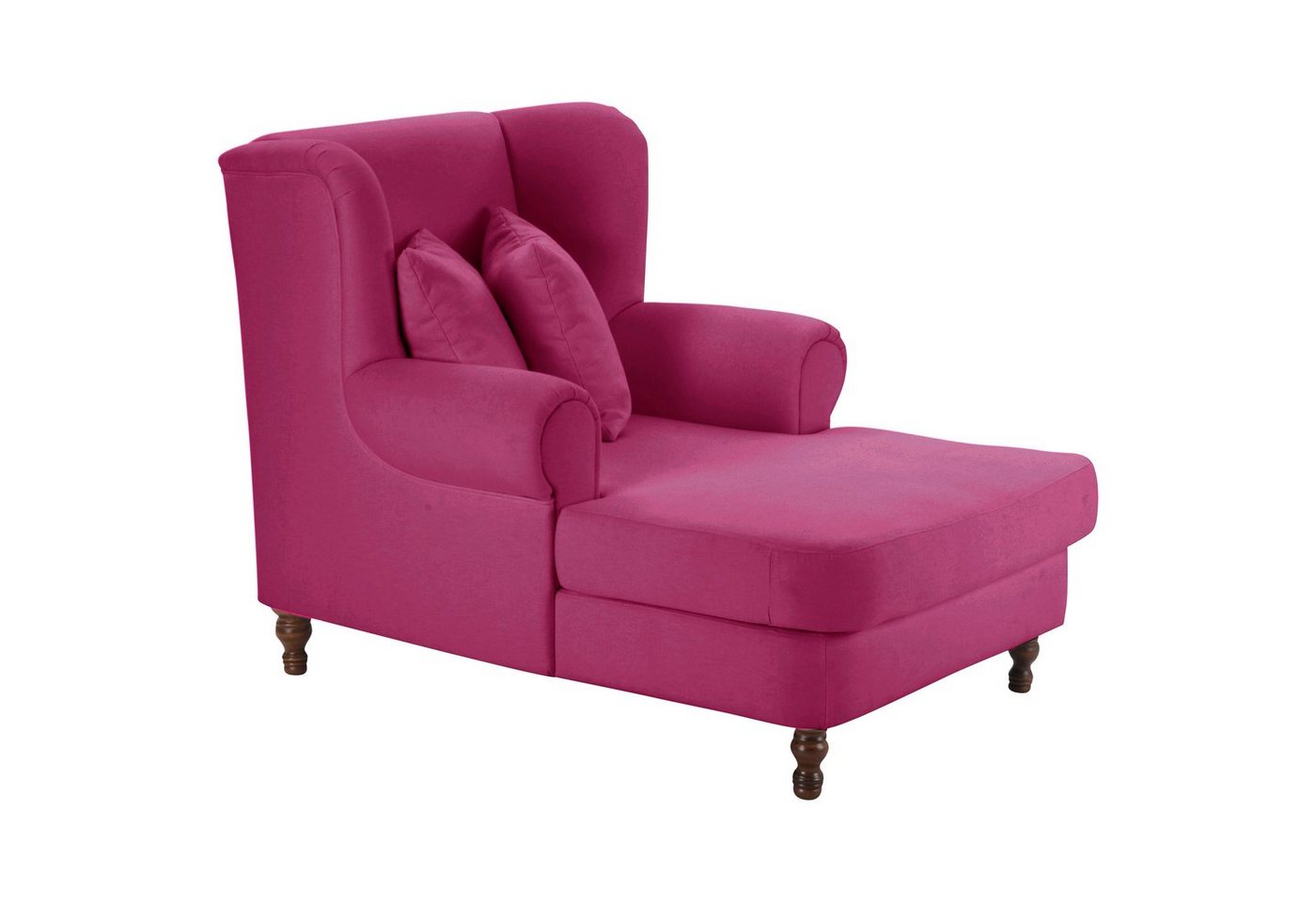Big-Sessel inkl. 2x Zierkissen 55x55cm &#43, 40x40cm SamtMegasessel mit integriertem Longchair im klassischen Ohrenbackenstil. Die Lieferung erfolgt inkl. 2 Zierkissen (55 x 55 cm und 40 x 40 cm). Außergewöhnlicher Blickfang für Ihr Wohnzimmer. Die gedrechselten Holzfüße runden das Gesamtbild ab. Die Füße sind zur einfachen Selbstmontage.Scheuertouren: &gt, 100.000Pilling: 4 – 5Lichtechtheit: 4Reibechtheit (trocken): 4 – 5Reibechtheit (nass): 4 – 5Pflege: waschbar bei 30 °C