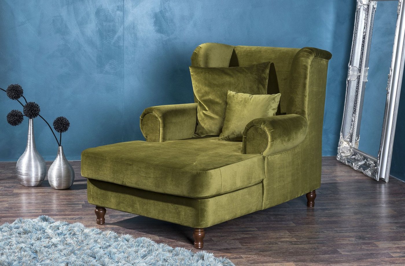 Big-Sessel inkl. 2x Zierkissen 55x55cm &#43, 40x40cm SamtMegasessel mit integriertem Longchair im klassischen Ohrenbackenstil. Die Lieferung erfolgt inkl. 2 Zierkissen (55 x 55 cm und 40 x 40 cm). Außergewöhnlicher Blickfang für Ihr Wohnzimmer. Die gedrechselten Holzfüße runden das Gesamtbild ab. Die Füße sind zur einfachen Selbstmontage.Scheuertouren: &gt, 30.000Pilling: 4Lichtechtheit: 5Reibechtheit (trocken): 4 – 5Reibechtheit (nass): 4 – 5