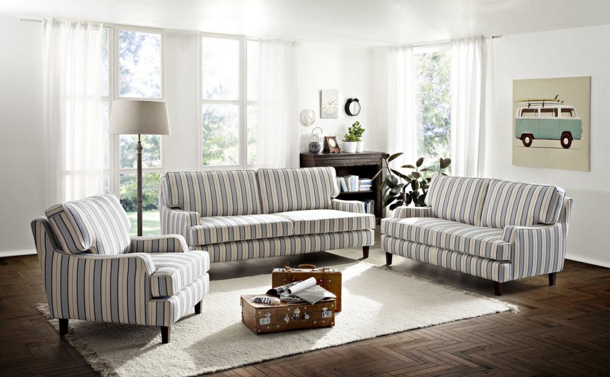 Sessel gestreiftMit seiner geschwungenen Form wird dieser wunderschöne Sessel der neue harmonische Mittelpunkt in Ihrem Wohnzimmer. Pete ist mit einem modernen Streifenstoff bezogen, welcher den Landhausstil perfekt unterstreicht. Die Sitz- und Rückenkissen sind lose und somit auch ohne große Mühe abnehmbar. Der Sessel ist frei im Raum stellbar, da die Rückseite mit Originalstoff bezogen ist. Die Füße sind zur einfachen SelbstmontageScheuertouren: &gt, 26.000Pilling: 4Lichtechtheit: 4 – 5Reibechtheit (trocken): 4 – 5Reibechtheit (nass): 4 – 5Pflege: waschbar bei 30 °C