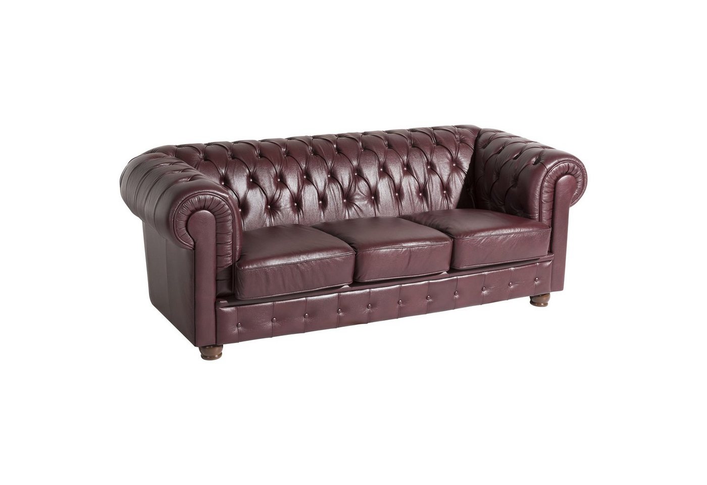 Sofa 3-Sitzer EchtlederBridgeport holt den englischen Chesterfield Stil in Ihr Wohnzimmer. Mit handwerklicher Wertarbeit wurden die aufwändigen Knopfheftungen im Rücken, an der Sitzrampe und den geschwungenen Armlehnen gefertigt. Gearbeitet mit viel Liebe zum Detail erhält dieses Sofa seinen markanten, unverwechselbaren Look. Auch die Rückseite ist original bezogen und ebenso verarbeitet, damit ist das Sofa frei im Raum stellbar.