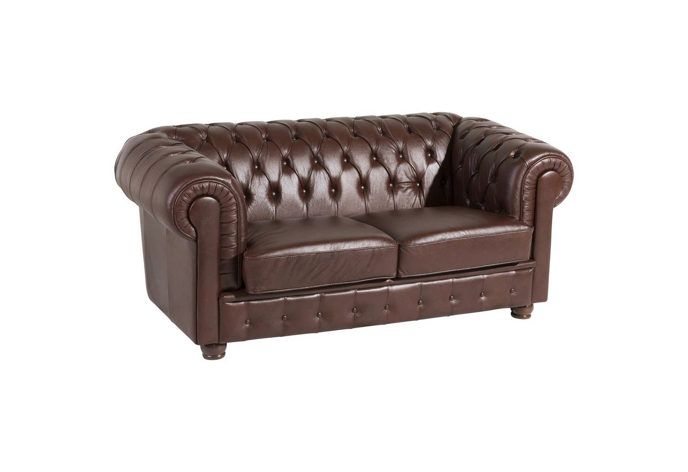 Sofa 2-Sitzer EchtlederBridgeport holt den englischen Chesterfield Stil in Ihr Wohnzimmer. Mit handwerklicher Wertarbeit wurden die aufwändigen Knopfheftungen im Rücken, an der Sitzrampe und den geschwungenen Armlehnen gefertigt. Gearbeitet mit viel Liebe zum Detail erhält dieses Sofa seinen markanten, unverwechselbaren Look. Auch die Rückseite ist original bezogen und ebenso verarbeitet, damit ist das Sofa frei im Raum stellbar.