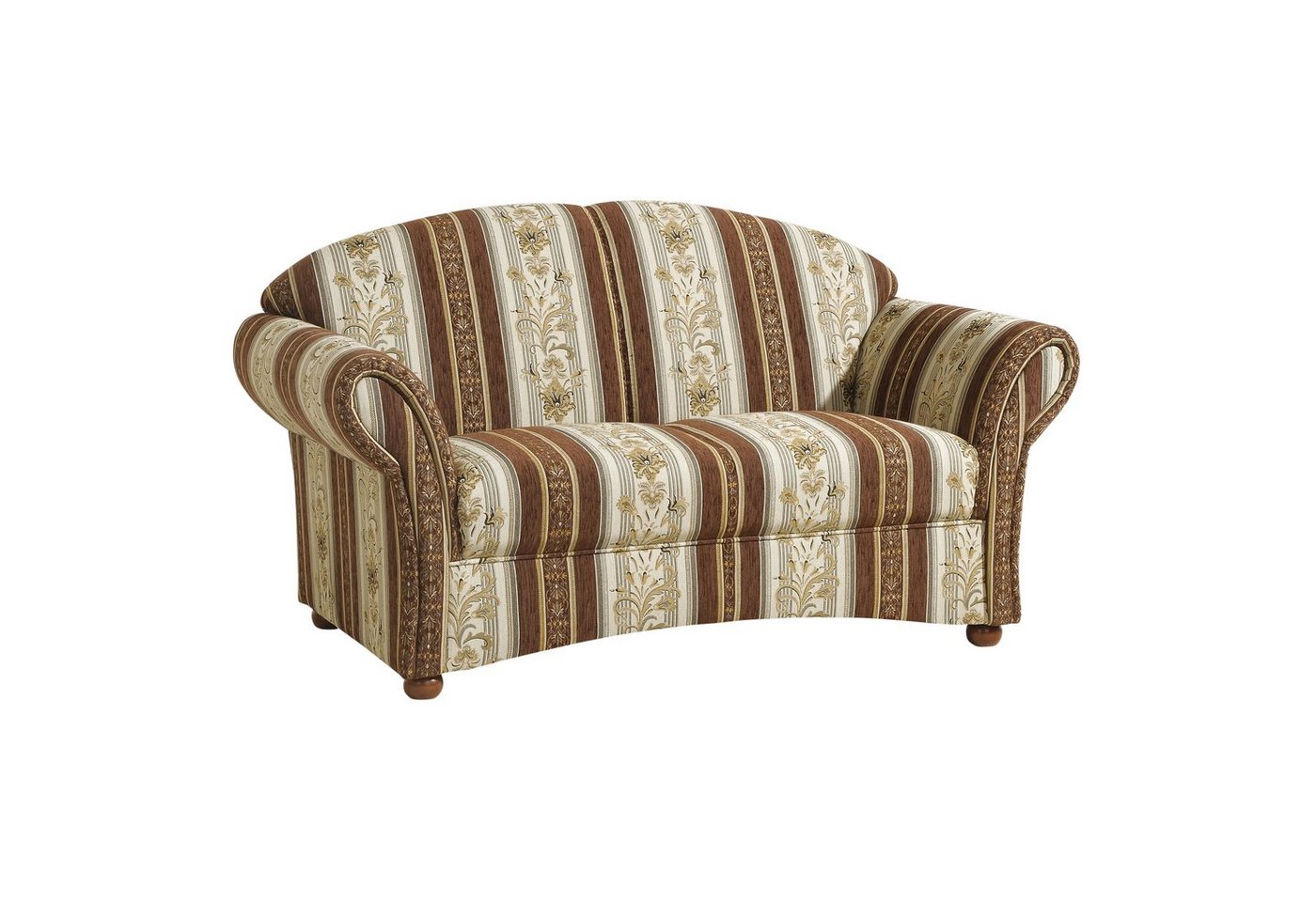 Sofa 2-Sitzer Chenille gemustertVollpolstersofa mit Chatosenseitenteil im Landhausstil. Romantisch verspielt gibt dieses wunderschöne Sofa Ihrem Raum eine besondere Note. Das florale Muster unterstreicht den wohnlichen Akzent. Die dunklen Buchefüße runden das Gesamtbild ab. Der Rücken ist mit Originalstoff bezogen, somit ist das Sofa frei im Raum stellbar. Die Füße sind zur einfachen Selbstmontage.Scheuertouren: 15.000Lichtechtheit: 4 – 5Reibechtheit (trocken): 5Reibechtheit (nass): 4 – 5