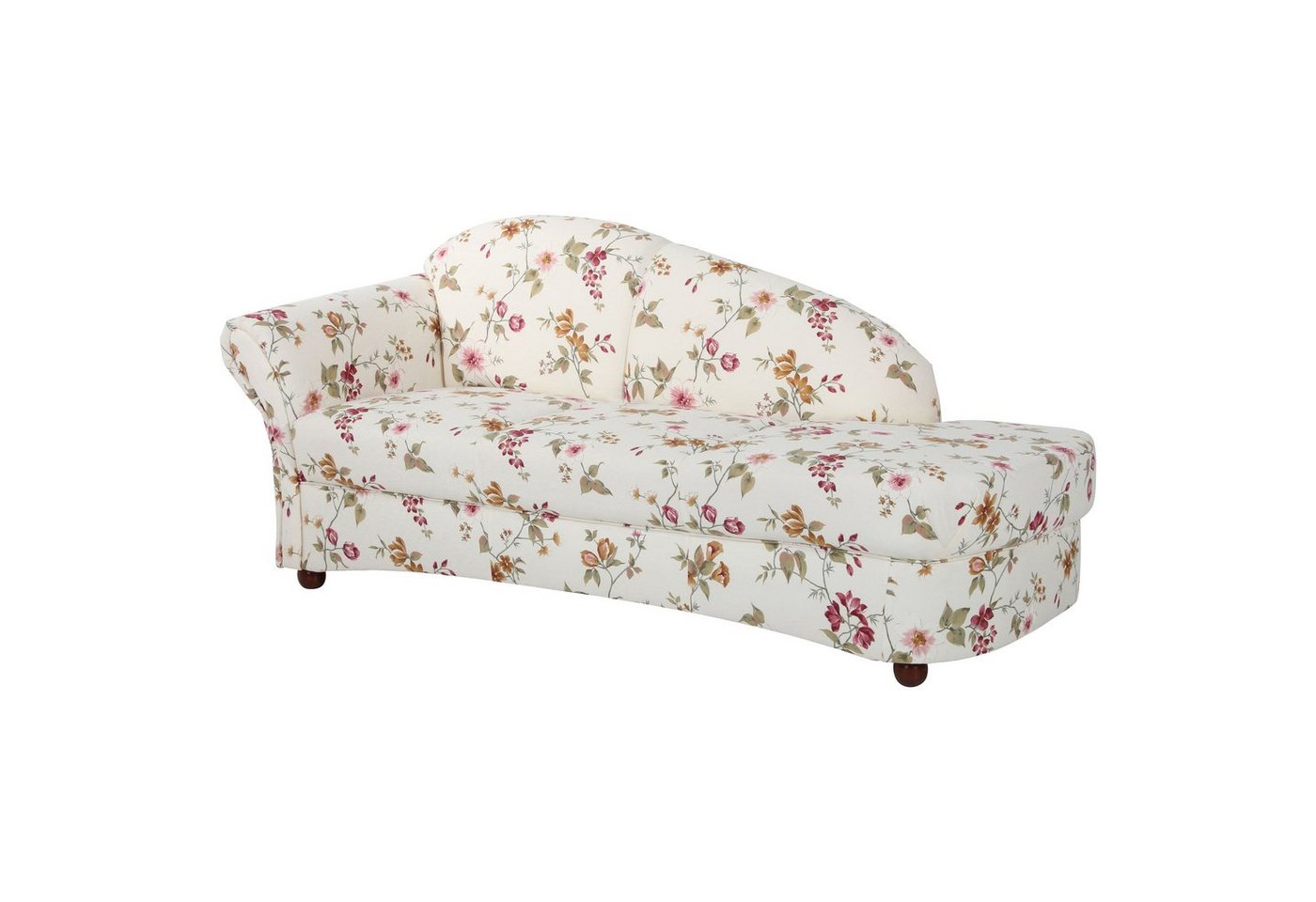 Recamiere Armlehne links geblümtVollpolsterrecamiere mit Chatosenseitenteil im Landhausstil. Romantisch verspielt gibt diese wunderschöne Recamiere Ihrem Raum eine besondere Note. Das florale Muster unterstreicht den wohnlichen Akzent. Die dunklen Buchefüße runden das Gesamtbild ab. Der Rücken ist mit Originalstoff bezogen, somit ist die Recamiere frei im Raum stellbar. Die Füße sind zur einfachen Selbstmontage.Scheuertouren: &gt, 24.000Pilling: 4Lichtechtheit: 5Reibechtheit (trocken): 4 – 5Reibechtheit (nass): 4 – 5
