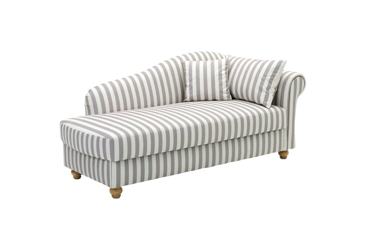 Recamiere Armlehne rechts gestreiftKlassische Recamiere im eleganten Landhausstil. Das geschwungene Armteil mit Chatose ist rechts oder links erhältlich. Im praktischen Stauraum unterhalb der Sitzfläche, der sich mit nur einem Handgriff öffnen lässt, können Decken und Kissen verstaut werden. Bequemer, mittelfester Sitzkomfort mit Federkern. Der pflegeleichte graue Stoffbezug ist zeitlos und lässt sich gut kombinieren. Die Kugelfüße aus massiver Buche sind erlefarbig lackiert und zur einfachen Selbstmontage.Scheuertouren: 75.000Pilling: 5Lichtechtheit: 4 – 5Reibechtheit (trocken): 4 – 5Reibechtheit (nass): 4 – 5
