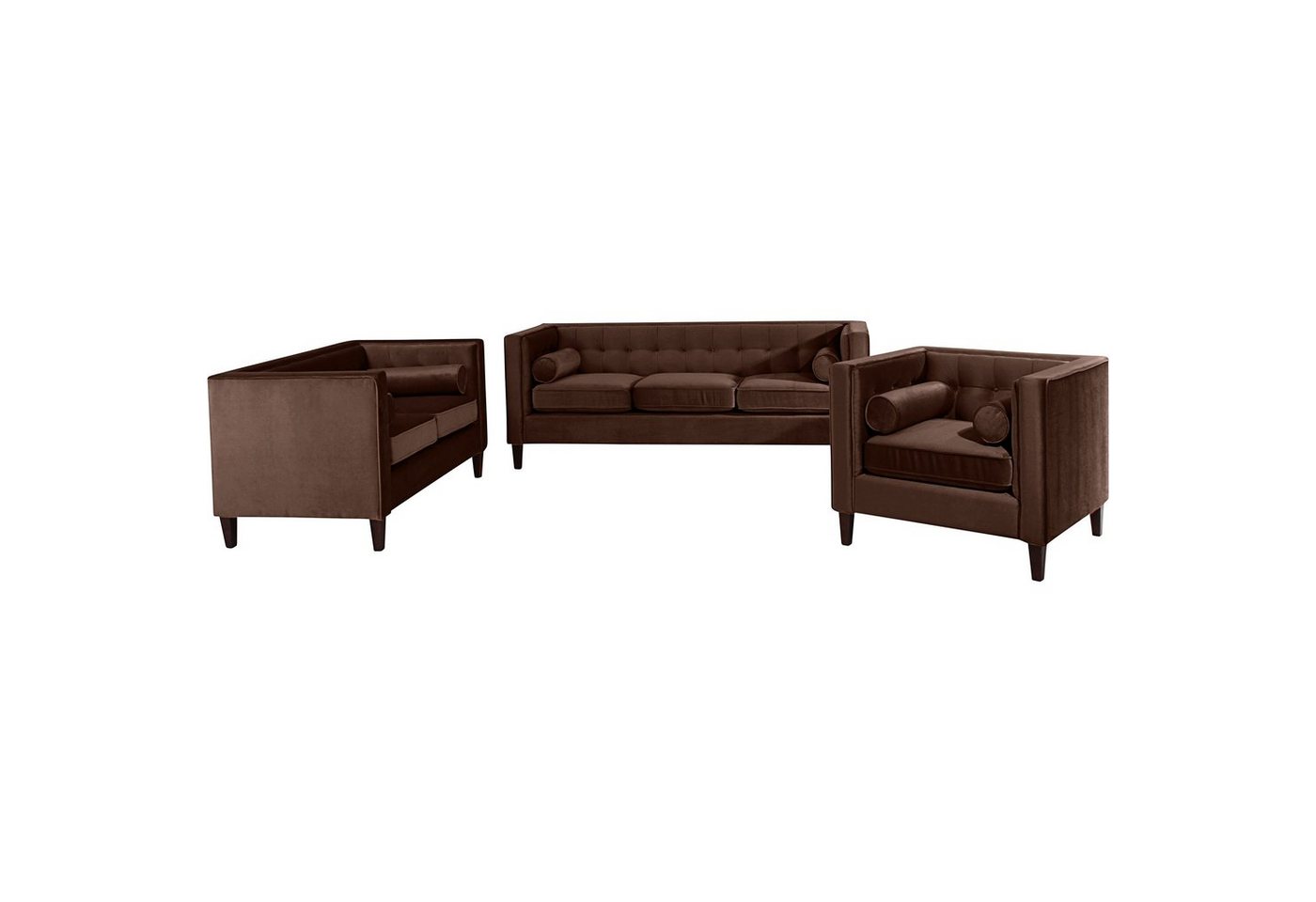 Sofa 3-Sitzer / Sofa 2-Sitzer / Sessel SamtDas Spar-Set Jeronimo präsentiert sich als moderner Blickfang im Chesterfield Stil und besteht aus einem Sofa 3-Sitzer, Sofa 2-Sitzer und einem Sessel. Das tolle Design ist geprägt von geraden Linien, einer hübschen Steppung im Rückenbereich und losen Zierkissen. Als Garnitur, aber auch einzeln stellbar, macht Jeronimo eine gute Figur! Die komfortable Wellenunterfederung, die hochwertige Polyätherschaum-Polsterung und das stabile Holzgestell laden zum Zurücklehnen und Entspannen ein. Die Füße sind zur einfachen Selbstmontage.Maße der Möbel (BxTxH):Sessel: 99 x 85 x 80 cm2-Sitzer: 154 x 85 x 80 cm3-Sitzer: 215 x 85 x 80 cmScheuertouren: 100.000Pilling: 5Lichtechtheit: 5Reibechtheit (trocken): 5Reibechtheit (nass): 5Pflege: chemische Reinigung