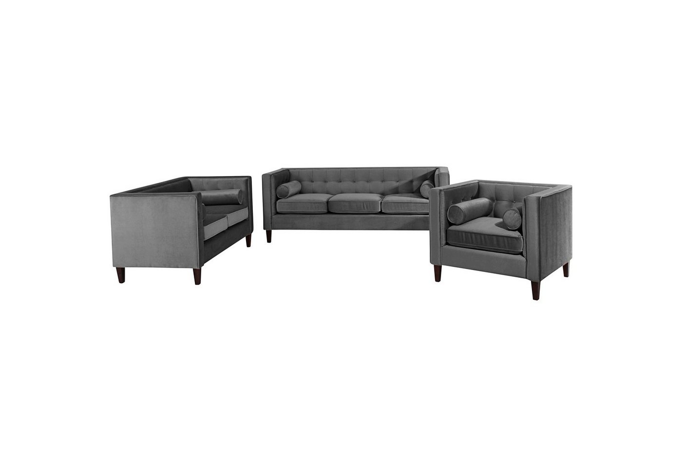 Sofa 3-Sitzer / Sofa 2-Sitzer / Sessel SamtDas Spar-Set Jeronimo präsentiert sich als moderner Blickfang im Chesterfield Stil und besteht aus einem Sofa 3-Sitzer, Sofa 2-Sitzer und einem Sessel. Das tolle Design ist geprägt von geraden Linien, einer hübschen Steppung im Rückenbereich und losen Zierkissen. Als Garnitur, aber auch einzeln stellbar, macht Jeronimo eine gute Figur! Die komfortable Wellenunterfederung, die hochwertige Polyätherschaum-Polsterung und das stabile Holzgestell laden zum Zurücklehnen und Entspannen ein. Die Füße sind zur einfachen Selbstmontage.Maße der Möbel (BxTxH):Sessel: 99 x 85 x 80 cm2-Sitzer: 154 x 85 x 80 cm3-Sitzer: 215 x 85 x 80 cmScheuertouren: 100.000Pilling: 5Lichtechtheit: 5Reibechtheit (trocken): 5Reibechtheit (nass): 5Pflege: chemische Reinigung