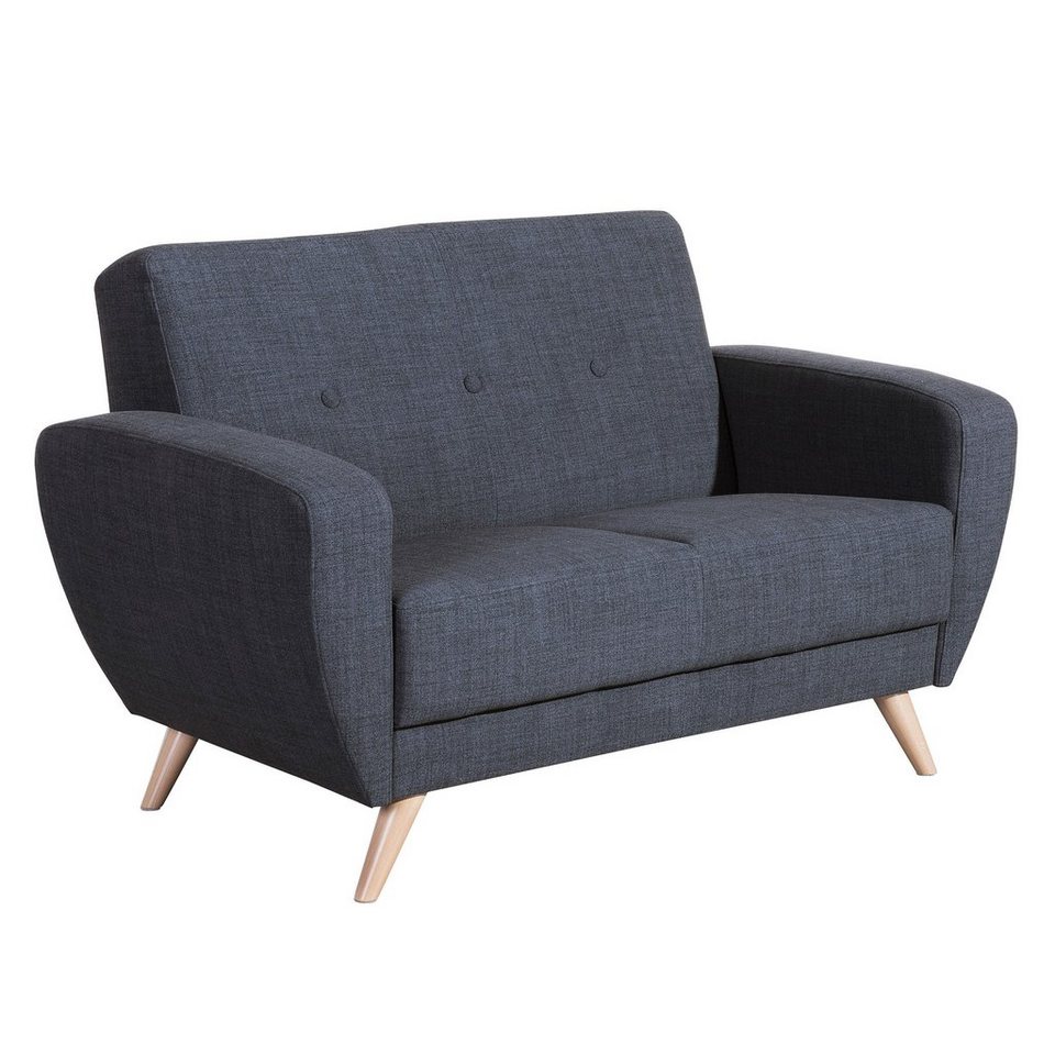 Sofa 2-SitzerKlassisches Sofa im Retro-Look, passend zur Möbelserie Jerry von Max Winzer®. Das Sofa überzeugt durch seine handwerkliche Verarbeitung mit Federkern in der Sitzfläche. Die Rückenpartie ist mit dekorativen Zierknöpfen versehen. Die elegant geschwungenen Armlehnen verjüngen sich nach unten und unterstreichen den Retro-Charme dieser kompakten Möbelserie. Der grob strukturierte Webstoff präsentiert sich aus einer Melange von unterschiedlichen Grautönen und verleiht dem Retro-Style einen modernen zeitgemäßen Look. Die filigranen Holzfüße aus massiver Buche verjüngen sich nach unten und unterstreichen die filigrane Optik des Sofas. Passend zum 2-Sitzer sind ein Sessel und ein 3-Sitzer mit Schlaffunktion erhältlich.Scheuertouren: 45.000Lichtechtheit: 4 – 5Reibechtheit (trocken): 4 – 5Reibechtheit (nass): 4