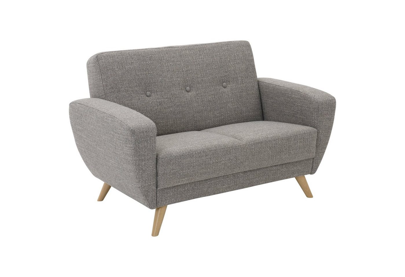 Sofa 2-Sitzer meliertKlassisches Sofa im Retro-Look, passend zur Möbelserie Jerry von Max Winzer®. Das Sofa überzeugt durch seine handwerkliche Verarbeitung mit Federkern in der Sitzfläche. Die Rückenpartie ist mit dekorativen Zierknöpfen versehen. Die elegant geschwungenen Armlehnen verjüngen sich nach unten und unterstreichen den Retro-Charme dieser kompakten Möbelserie. Der grob strukturierte Webstoff präsentiert sich aus einer Melange von unterschiedlichen Grautönen und verleiht dem Retro-Style einen modernen zeitgemäßen Look. Die filigranen Holzfüße aus massiver Buche verjüngen sich nach unten und unterstreichen die filigrane Optik des Sofas. Passend zum 2-Sitzer sind ein Sessel und ein 3-Sitzer mit Schlaffunktion erhältlich.Scheuertouren: >, 100.000Pilling: 4 – 5Lichtechtheit: 5Reibechtheit (trocken): 4 – 5Reibechtheit (nass): 4 – 5