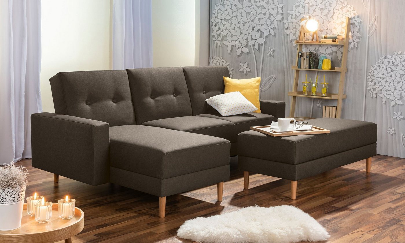 Funktionssofa mit HockerZeitlos klassische Longchair-Garnitur mit aufwendiger Knopfheftung im Rücken und edlen Füßen aus massivem Holz. Der Longchair ist wahlweise rechts oder links montierbar. Damit passt sich die Garnitur Ihrer individuellen Wohnsituation an. Die Rückenlehne ist 5-fach verstellbar. Für optimalen Sitzkomfort sorgt ein schaumummantelter Federkern in der Sitzfläche. Der mitgelieferte Stauraumhocker ergänzt die Garnitur perfekt und lässt sich am Sofa fixieren. In Verbindung mit der zurückgeklappten Rückenlehne entsteht so eine große Liegefläche von ca. 170 x 200 cm.Scheuertouren: &gt, 100.000Pilling: 4 – 5Lichtechtheit: 4 – 5Reibechtheit (trocken): 4 – 5Reibechtheit (nass): 4 – 5