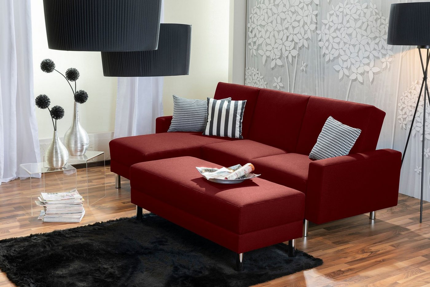 Funktionssofa mit HockerModerne Longchair-Garnitur in schlichtem, zeitlosen Design. Der Longchair ist wahlweise rechts oder links montierbar. Damit passt sich die Garnitur Ihrer individuellen Wohnsituation an. Die Rückenlehne ist 5-fach verstellbar. Für optimalen Sitzkomfort sorgt ein schaumummantelter Federkern in der Sitzfläche. Der mitgelieferte Stauraumhocker ergänzt die Garnitur perfekt und lässt sich am Sofa fixieren. In Verbindung mit der zurückgeklappten Rückenlehne entsteht so eine große Liegefläche von ca. 170 x 200 cm. Die verchromten Metallfüße unterstreichen den modernen Look.Scheuertouren: &gt, 100.000Pilling: 4 – 5Lichtechtheit: 4 – 5Reibechtheit (trocken): 4 – 5Reibechtheit (nass): 4 – 5