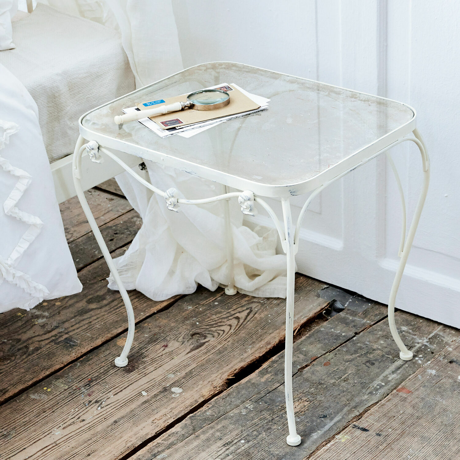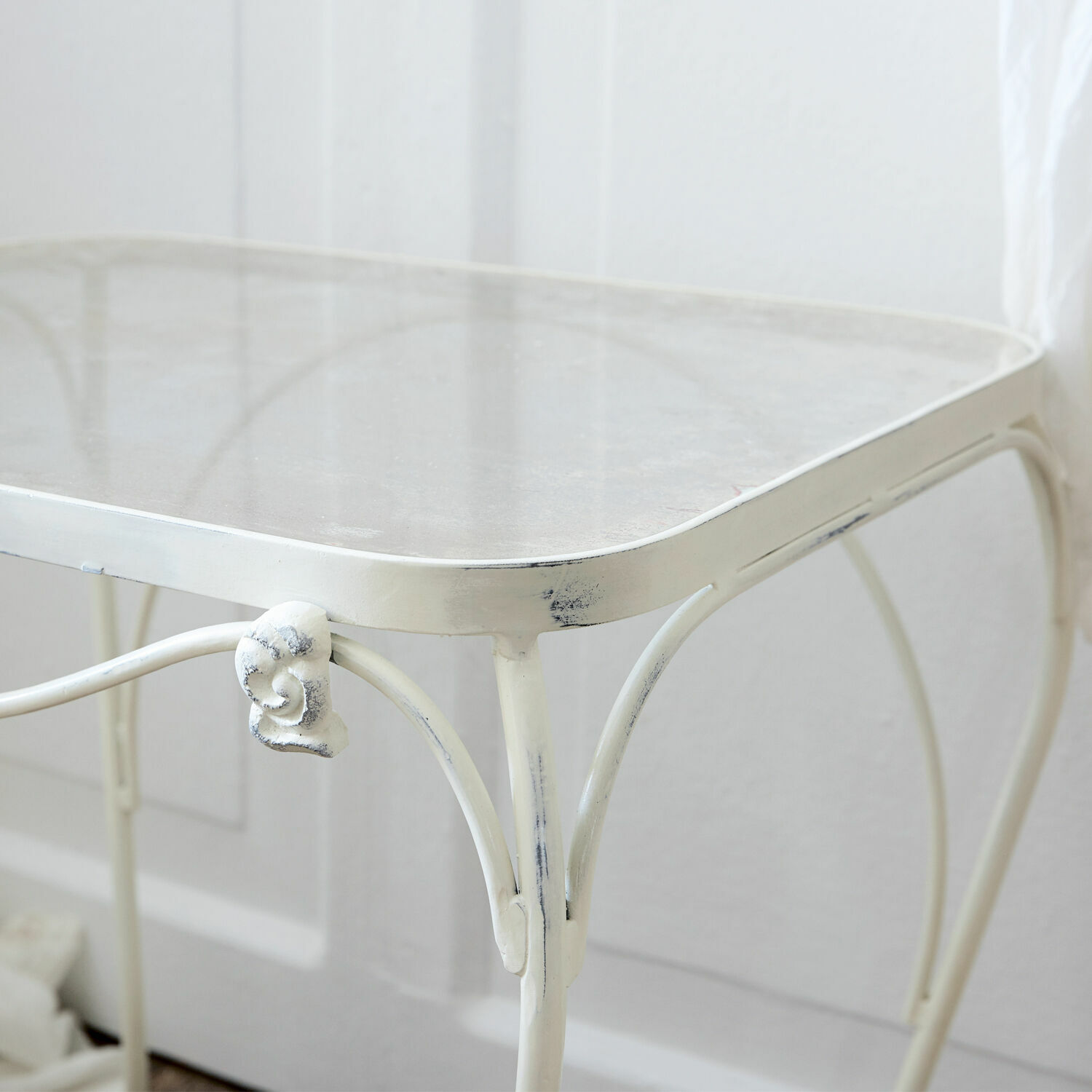 Zwischen Purismus und nostalgischer Eleganz bewegt sich dieser Nachttisch mit seiner hochwertigen Verarbeitung aus stabilem Eisen. In Frankreich hatte man schon in der Jahrhundertwende das Material für den Interieurbereich entdeckt. Kein Wunder, zeichnet es sich doch durch ästhetische und praktische Qualitäten gleichermaßen aus. Gefertigt nach französischen Vorbildern glänzt dieses Beistellmöbel mit vielen Reizen. Das schön geschwungene, vierfüßige Gestell aus Eisen ist mit kleinen Zierornamenten veredelt, was die gestalterische Liebe zum Detail perfekt unterstreicht. Darauf trohnt eine Glasplatte mit Antik-Finish in leicht verwischter Optik, die bereits Vergangenheit symbolisiert. Weiche Filzgleiter an den Kanten sorgen dafür, dass das Glas sanft aufliegt. Ein echtes Schmuckstück im Shabby-Chic, das im Schlafzimmer viel Romantik entfaltet und bewundernde Blicke auf sich zieht.
