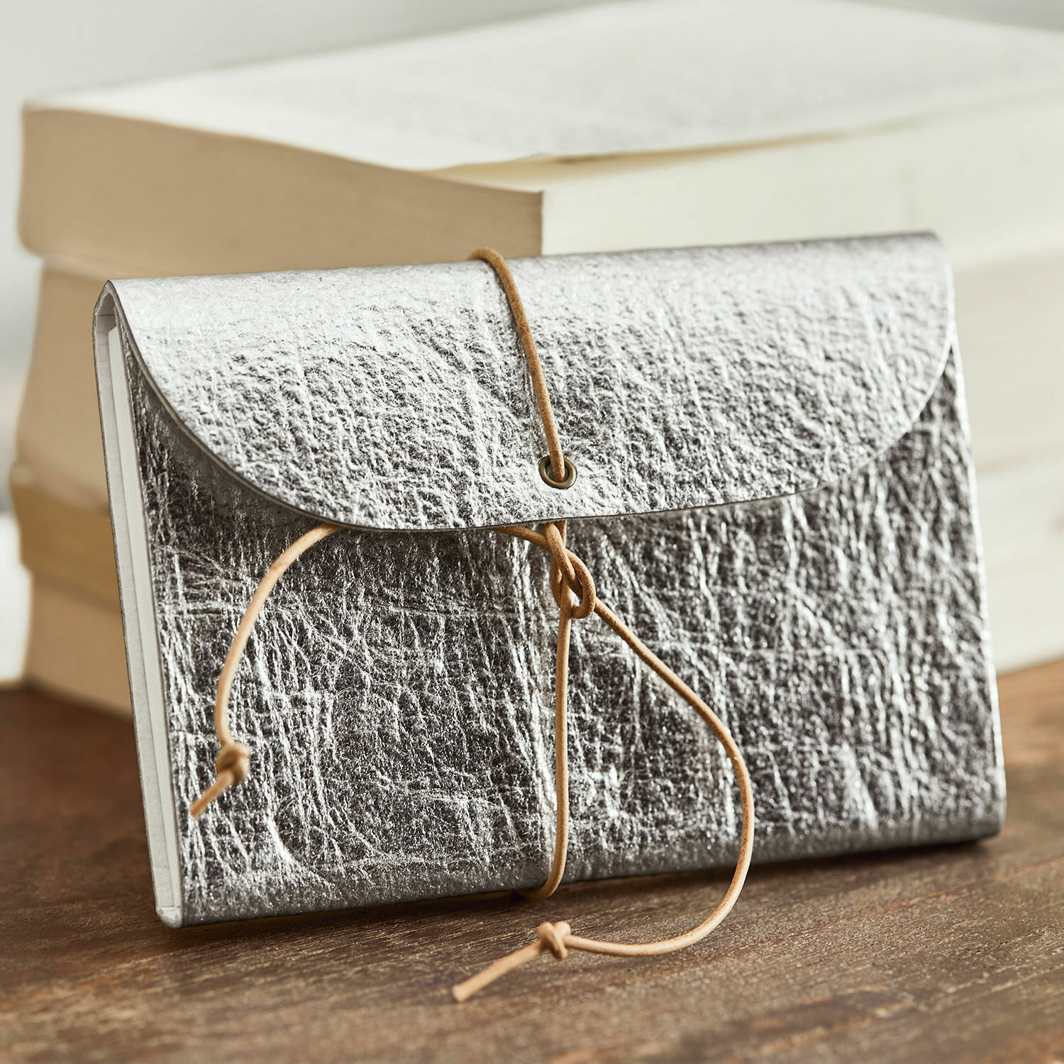 Ein stilvoller Begleiter, der immer zur Hand ist und Sie an alles erinnert, was im Trubel des Tages leicht aus den Gedanken gerissen und auf Nimmerwiedersehen verweht wird: Das praktische Notizbuch freut sich über alles, was Sie hineinschreiben. Ob all die vielen kleinen Sachen für Ihren nächsten Einkauf, die Geburtstage Ihrer Liebsten, Mitschriften bei Meetings, Ihre Ideen für die nächste Kreation – oder Ihre ganz persönlichen Tagebuchaufzeichnungen mit Ihren geheimen Wünschen, Träumen und Hoffnungen. Hier ist alles aufbewahrt wie in einer Schatztruhe – und das ganz stilsicher und schmuckvoll. Die Seiten bestehen aus handgeschöpften Papier und der Einband ist aus glänzendem Material, hinzu kommt ein edles Lederband zum Zuschnüren. Rundum perfekt!