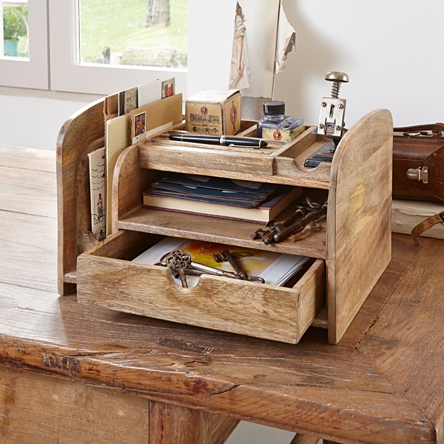 Funktionell und schön zugleich. Aus Mangoholz mit Antik-Finish. Mit einer Schublade und diversen Fächern.