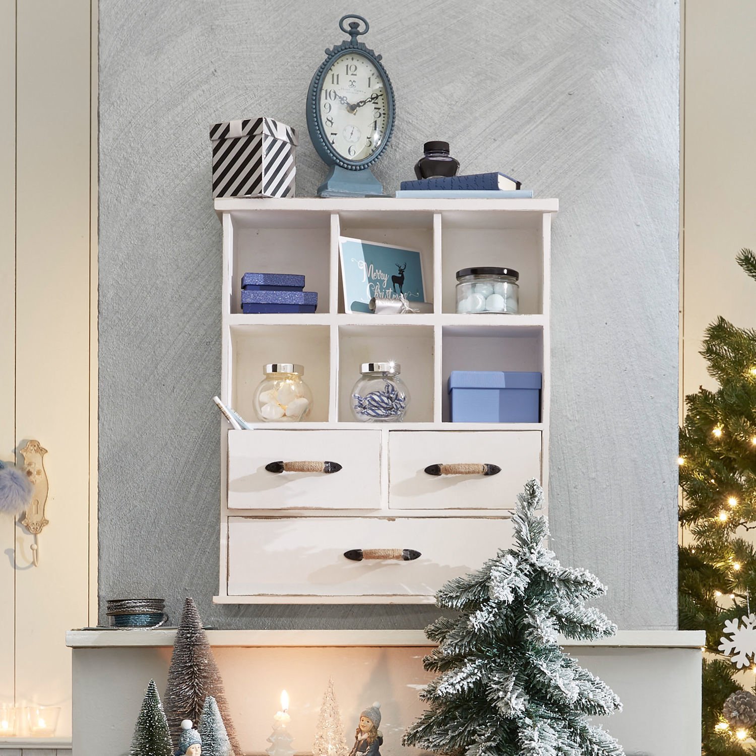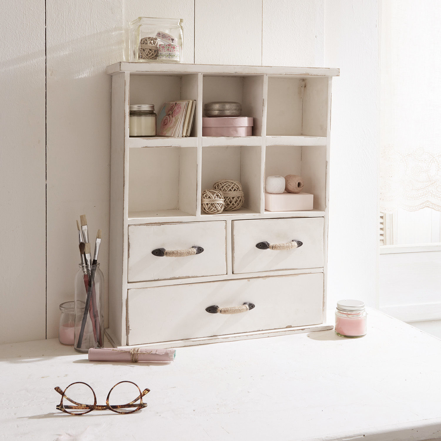 Ordnungshelfer haben ohne Frage in erster Linie eine praktische Funktion, sie dürfen aber gerne daneben auch eine Augenweide sein. Wie es diesem Organizer auf charmante Weise gelingt. Er ist sorgsam aus massivem Mangoholz gefertigt und bietet in seinen offenen Fächern wie in den Schubladen vielen Utensilien einen festen Platz. Damit Sie nie mehr auf der Suche nach Dingen sind, die Sie oft brauchen, aber nicht schnell zur Hand haben. Das können Dinge zum Basteln oder Verpacken von Geschenken sein, wie Kleber, Schnur, Pinsel und Co. Das können aber auch Briefe sein, die Sie noch nicht beantwortet haben oder gerne stets zur Hand haben. Oder suchen Sie einen Platz für Ihren Modeschmuck? Oder das Nähzeug? Oder, oder, oder. Sie sehen, es gibt viele Möglichkeiten, wie Sie der Organizer im Alltag unterstützen kann, denn jetzt finden Sie das jeweils Gesuchte fast mit geschlossenen Augen in einem seiner Fächer. Wobei es schade wäre, die Augen vor ihm zu verschließen, denn mit seiner nostalgischen Anmutung und dem dezenten Shabby-Finish bringt er auch einen Hauch Romantik in Ihr Zuhause. Ein weiterer Vorzug: Der Organizer überlässt es ganz Ihnen, ob Sie ihn lieber auf eine Konsole oder einen Schreibtisch stellen oder ob Sie ihn an die Wand hängen. Er ist für beide Möglichkeiten perfekt ausgerüstet.