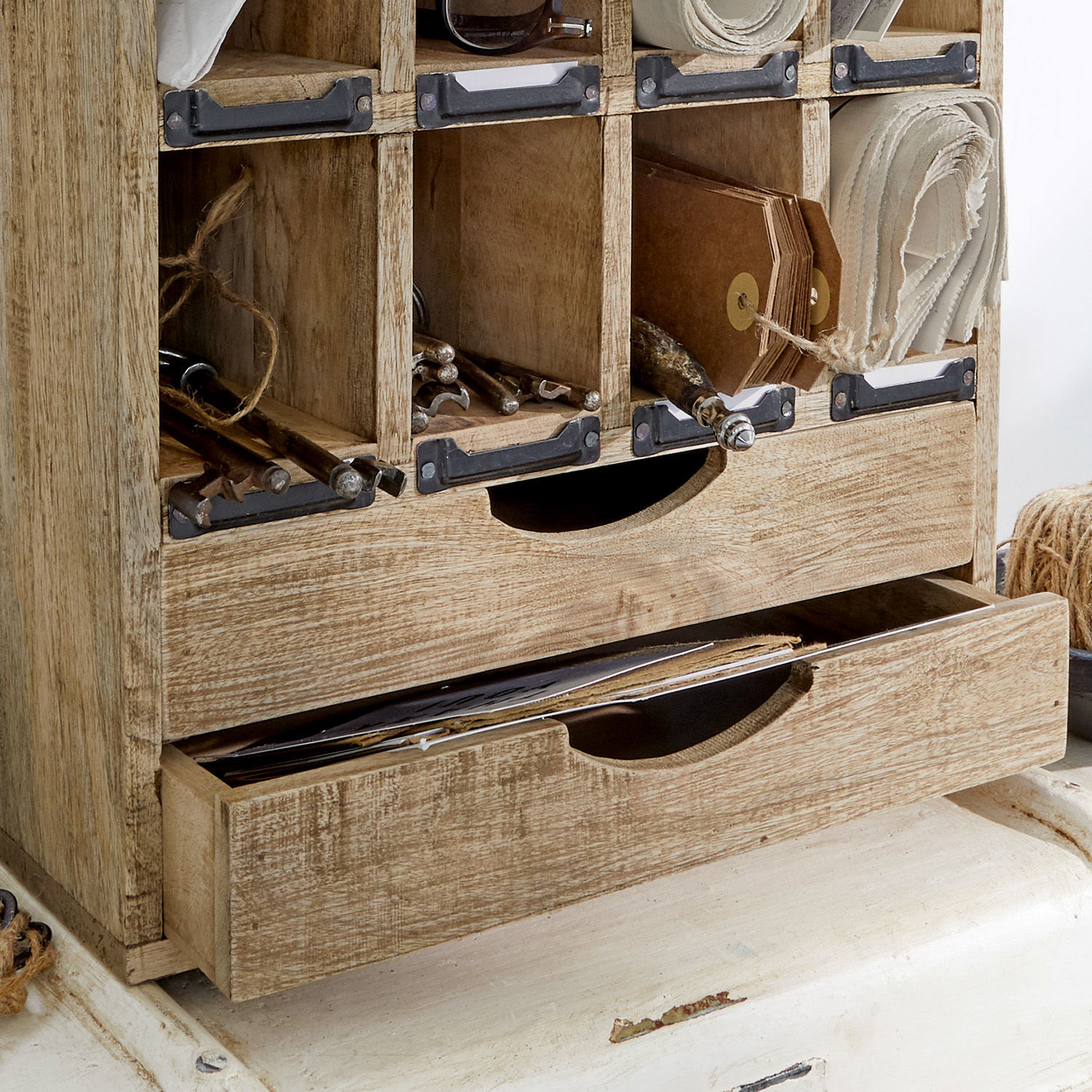 Sie haben gleich auf den ersten Blick erkannt, wie perfekt Sie in diesem Organizer Ihre Rechnungen und Kontoauszüge, die Stifte, den Locher, Kleber, Scheren, Schreibpapier, Paketschnur, Notizzettel usw. unterbringen können? Da haben Sie Recht, denn mit den acht geräumigen Fächern und den Schubladen bietet der Mini-Schreibtisch auf kleinstem Raum viel Platz für dies und das und jenes. Dank der offenen Fächer sehen Sie gleich, wo das Gesuchte liegt, so dass langes Suchen endlich der Vergangenheit angehört. bei Zweifeln helfen die kleinen Einsteckfächer für Beschriftungen. Die beiden Schubfächer mit den bequemen Eingriffsmulden sind ausreichend groß dimensioniert, um alle Papiere im DIN A4 Format bequem unterzubringen. Doch ein Organizer wie dieser hier kann noch eine ganze Menge mehr. Gerne wird die kleine Ordnungshilfe auch als stilvoller Aufbewahrungsort für Schmink- und Kosmetikartikel genutzt. Oder sind Sie eine passionierte Hobbykünstlerin? Dann werden Sie froh sein, endlich einen ebenso praktischen wie aparten Platz für Ihre Kohlestifte und die Farbtuben, das Linolmesser und den Kalligrafie-Füller gefunden zu haben. Und bei allen funktionalen Vorzügen gelingt es dem Organizer ganz nebenbei auch, ein dekorativer Blickfang im Raum zu sein. Er ist sorgfältig aus massivem Mangoholz gefertigt, das nicht nur äußerst strapazierfähig ist, sondern auch eine markante Maserung zeigt, während das Antik-Finish dem Organizer historischen Charakter verleiht.