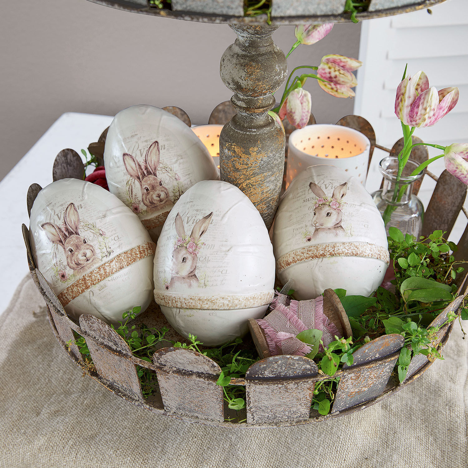 Sie wünschen sich eine stilvolle Oster-Dekoration mit nostalgischem Charme? Dann ist dieses edle Quartett genau richtig. Die vier schönen Deko-Eier aus feinem Porzellan sind mit reizenden Häschen-Motiven bedruckt. Sie erinnern an die gute, alte Zeit und passen ideal zum Shabby-Chic. Die eleganten Eier lassen sich sehr kreativ dekorieren und verzaubern jedes Jahr wieder das Osterfest. Auf der Fensterbank, dem Tisch oder im Osternest versprühen sie ihren Charme. Die detailreich verzierten Schmuckstücke sind einfach eine Freude.