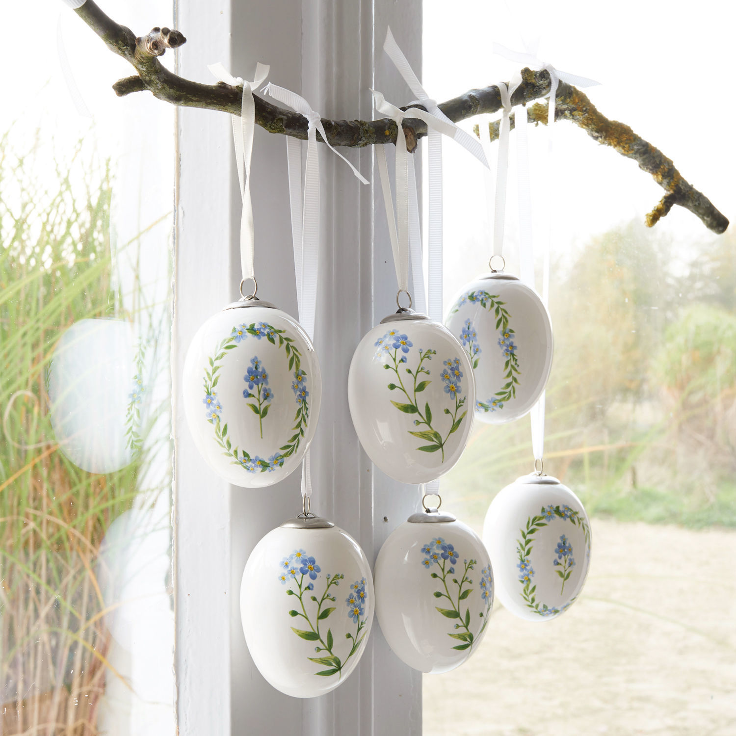 Eine wunderbare Prise Nostalgie weht mit diesem hübschen Set in Ihr Zuhause. Die sechs stilvollen Deko-Eier aus Porzellan sind mit einem kunstvollen Vergissmeinnicht-Druck in Vintage-Optik verziert, dessen zarte Blüten und Ranken das Auge erfreuen. Das Motiv erinnert an glückliche Tage in Großmutters Garten – einfach wunderschön nostalgisch. Das edle Set ist die perfekte Ergänzung zum Shabby-Chic. Es macht nicht nur in der Osterzeit eine gute Figur, sondern könnte sogar das ganze Jahr über Ihr Heim zieren. Jedes Ei ist bereits mit einem passenden Band ausgestattet, sodass es wirklich gleich mit der Dekoration losgehen kann. Eine Hakenleiste, Äste oder Zweige in der Vase freuen sich auf diesen liebreizenden und sehr romantischen Schmuck.