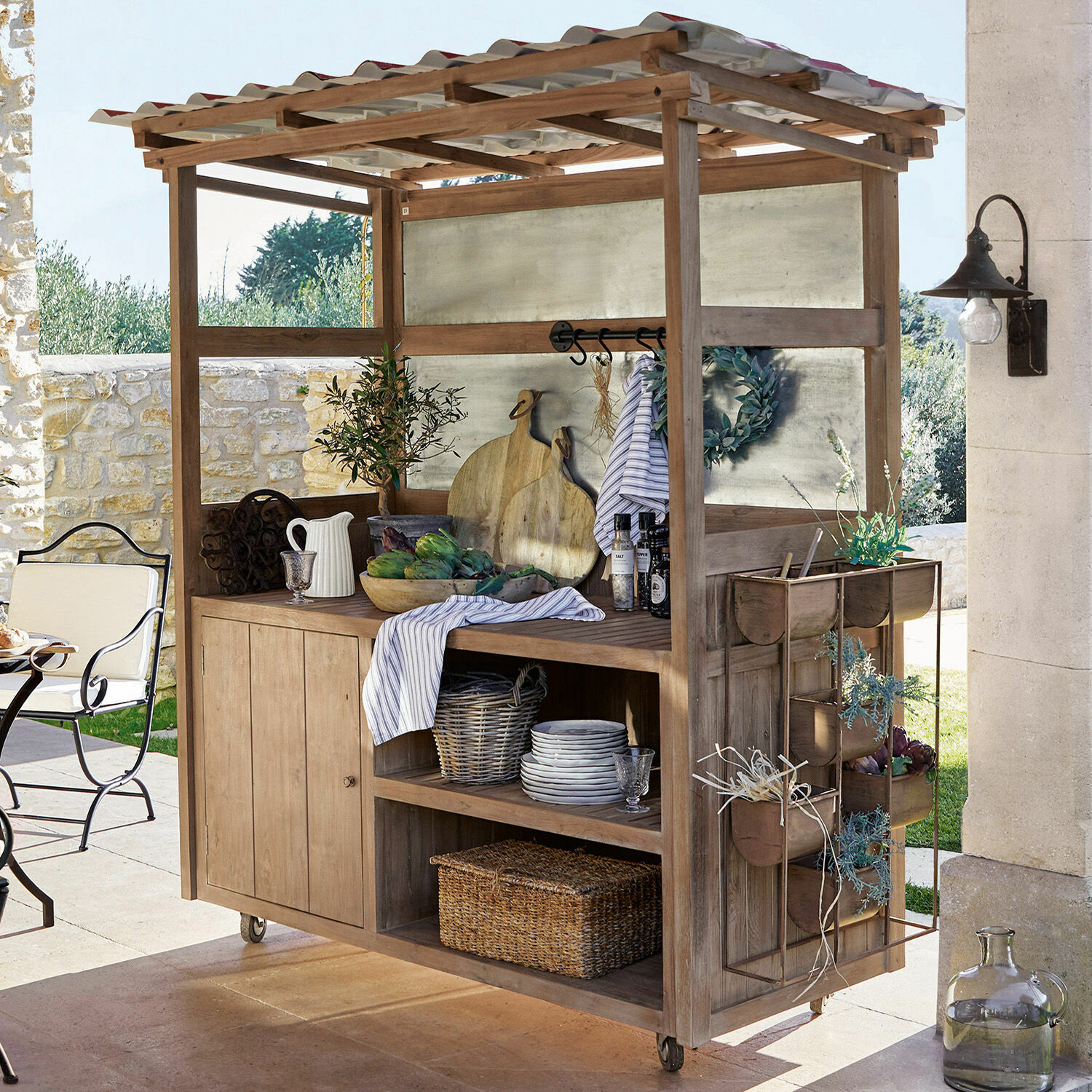 Hobby-Köche aufgepasst! Sie haben Freude an der Zubereitung von Speisen, bedauern es aber, dafür an schönen Sommertagen in der Küche stehen zu müssen, während die Familie oder Freunde gemütlich auf der Terrasse plaudern? Dann brauchen Sie eine Outdoor-Küche. Mit der Sie Ihrer Leidenschaft unter freiem Himmel nachgehen und sich gleichzeitig an der Unterhaltung beteiligen können. Und ganz gleich, ob Sie grillen, knackige Salate, raffinierte Canapés oder eine deftige Brotzeit zubereiten – diese Outdoor-Küche wird Ihnen dabei auf ebenso praktische wie stilvolle Weise assistieren. Mit der robusten Arbeitsplatte, dem offenen Regalteil und den Fächern hinter den Türen, in denen das Outdoor-Geschirr, Besteck, Servietten, Salatschüssel usw. untergebracht sind, während andere Kochutensilien an der eisernen Hakenleiste auf ihren Einsatz warten. Neben dem praktischen Nutzen ist die Outdoor-Küche aber auch ein echtes Schmuckstück, das sorgfältig aus edlem Teakholz gefertigt wurde. Es zeigt eine natürliche, ausdrucksstarke Maserung, während es zugleich mit außergewöhnlicher Wetterfestigkeit begeistert. Denn Teakholz ist eines der härtesten Edelhölzer und perfekt auf ein langes Leben im Freien eingerichtet. Mit vier leichtgängigen Rollen lässt sich die Outdoor-Küche mal mehr ins Zentrum, mal in den Hintergrund rücken. Und wenn Sie nicht nur Hobby-Koch, sondern auch leidenschaftlicher Hobby-Gärtner sind, wird Ihnen die Outdoor-Küche auch beim Umtopfen, Pikieren usw. gute Dienste leisten.
