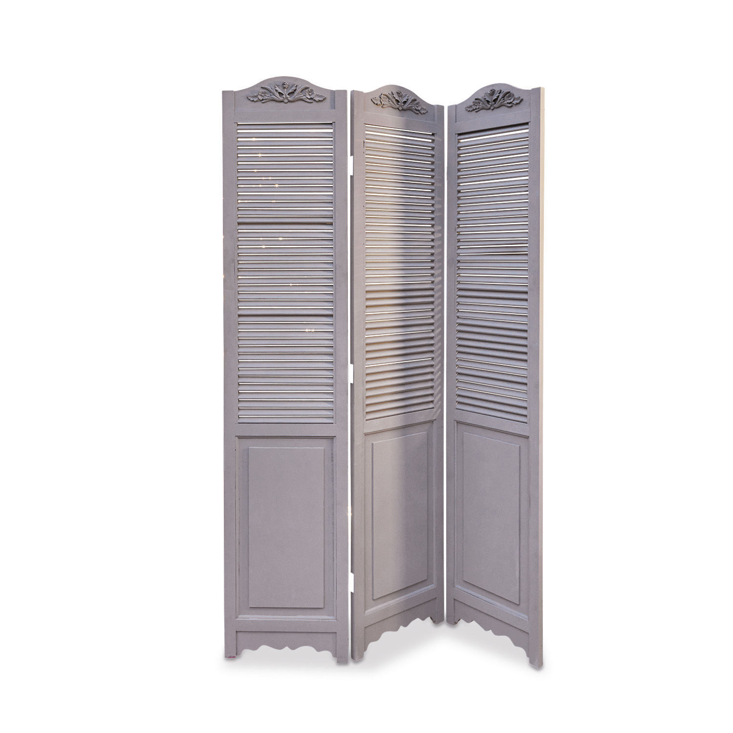 Dieser charmante Raumteiler vermählt traditionelle Handwerkskunst mit klassischer Eleganz. Das hochwertige Tannenholz ist sehr aufwendig gearbeitet. Die stilvolle Lamellenoptik harmoniert ausgezeichnet mit den raffinierten Ornamenten, welche die Stirn jedes Flügels zieren. Die eisernen Scharniere sind nicht nur äußerst robust und langlebig, sondern auch in puncto Design perfekt angepasst. Das helle Finish kontrastiert wunderbar mit den dunklen Scharnieren und sorgt für einen Look, der sich wohltuend von der Masse abhebt. Der Paravent ist fast blickdicht und ideal, um Teile eines Raums auf stilvolle Art und Weise abzutrennen.