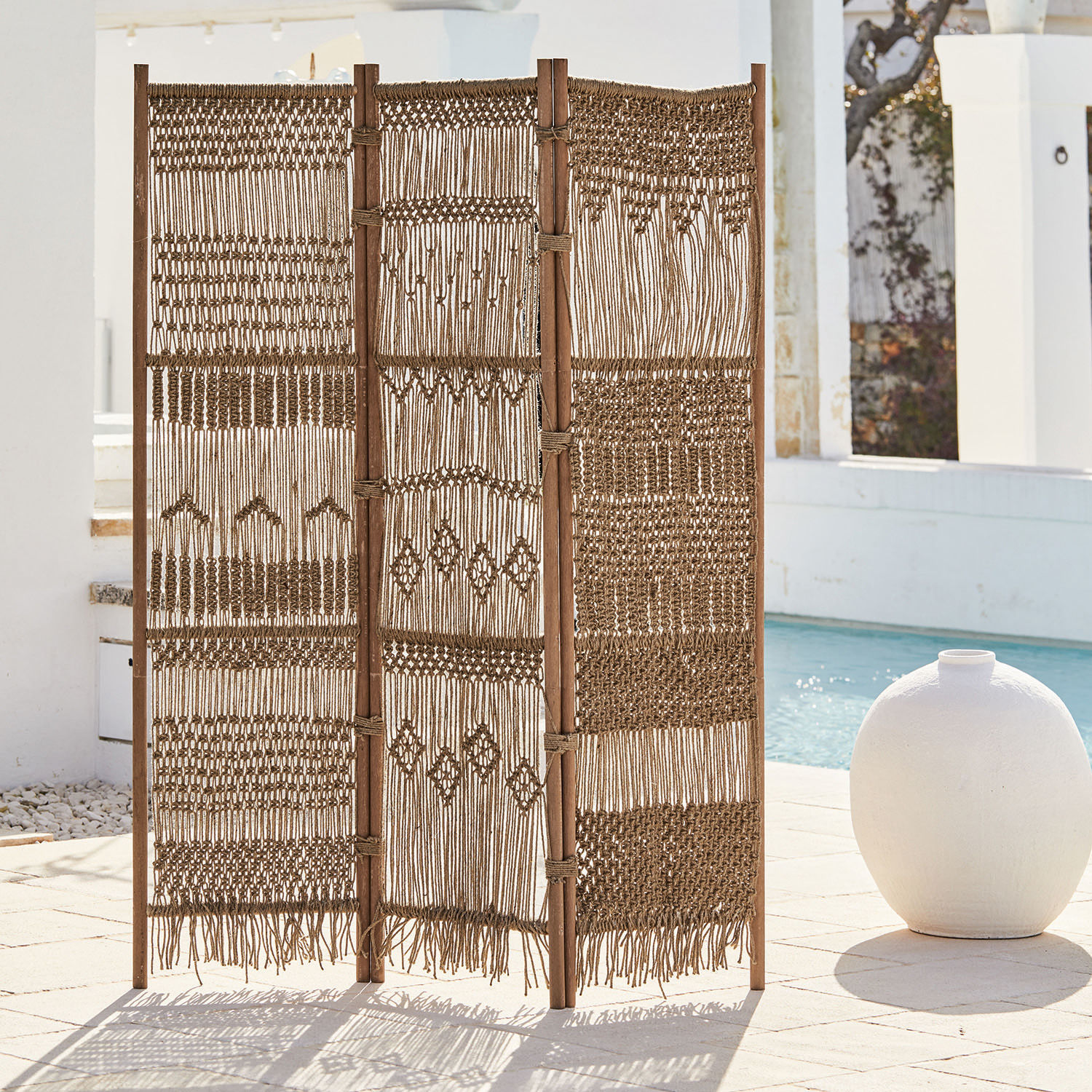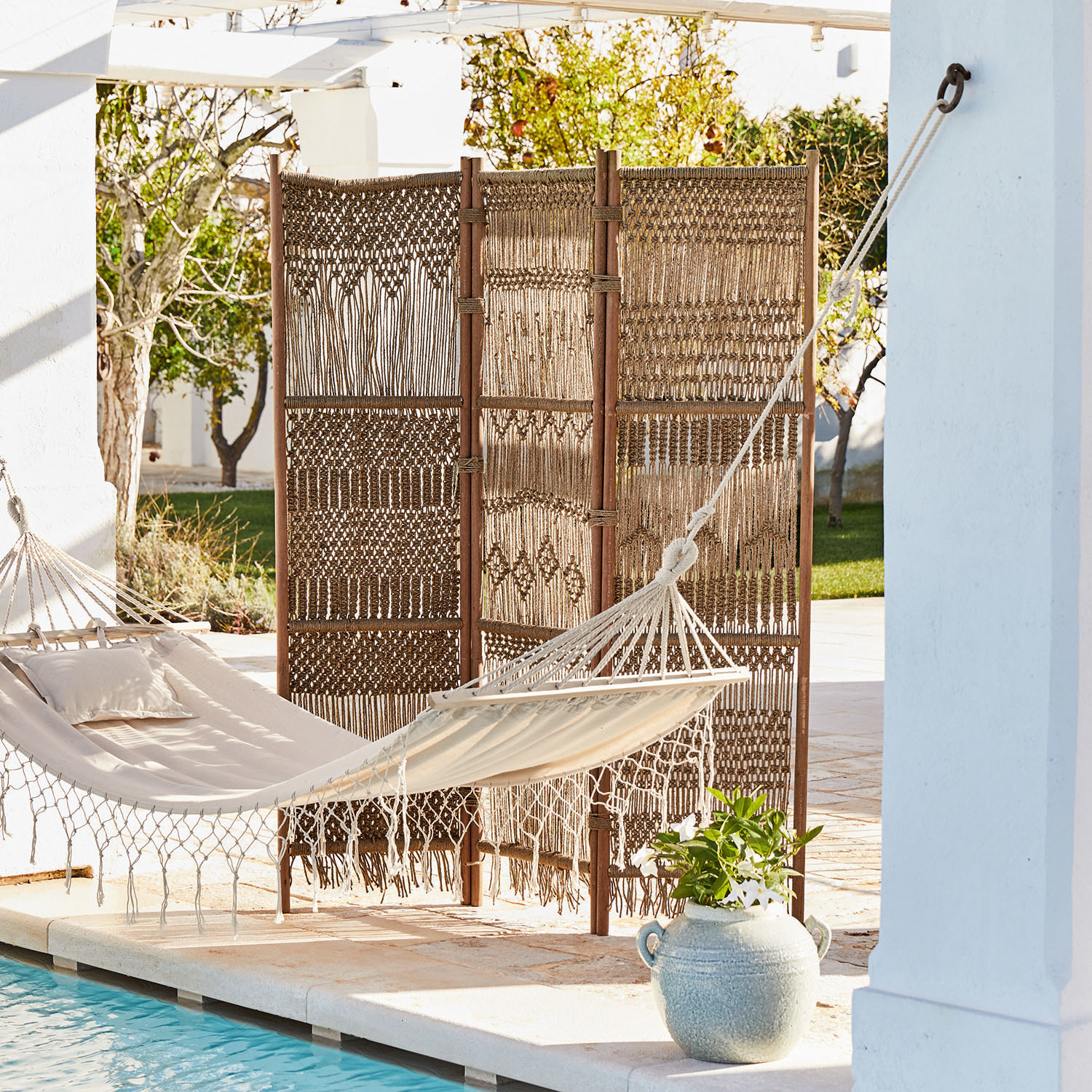 Der Paravent ist eine wunderbare Möglichkeit, um dauerhaft reizvolle Gliederungen im Wohnbereich zu schaffen, unschöne Ecken zu verstecken oder sich vor neugierigen Blicken zu schützen. Handwerklich perfekt verarbeitet und praktisch durchdacht präsentiert sich dieses Modell im Gegensatz zu vielen anderen Raumtrennern als standfeste Institution. Dafür sorgt vor allem der besonders robuste Rahmen aus charaktervollem Salholz, der in drei individuell klappbare Segmente aufgeteilt ist. Der Ethno-Charme ist unverkennbar: Jedes dieser Elemente ist mit drei unterschiedlichen Makramee-Geflechten aus natürlichem Jutegarn bezogen. Zusammen ergeben sie ein traumhaft schönes Bild mit sensationeller Wirkung. Ein einzigartiges Schmuckstück, das nicht nur im Wohn- und Schlafzimmer für den ganz individuellen Glamour sorgt, auch auf Ihrer Loggia verleiht der Raumteiler lebendige Strukturen und eine außergewöhnliche Stimmung. Mit typischen Wohnaccessoires wie kuscheligen Sitzkissen, Hängematte und vielen Windlichtern zelebrieren Sie Gemütlichkeit pur auf die schönste Art und Weise.