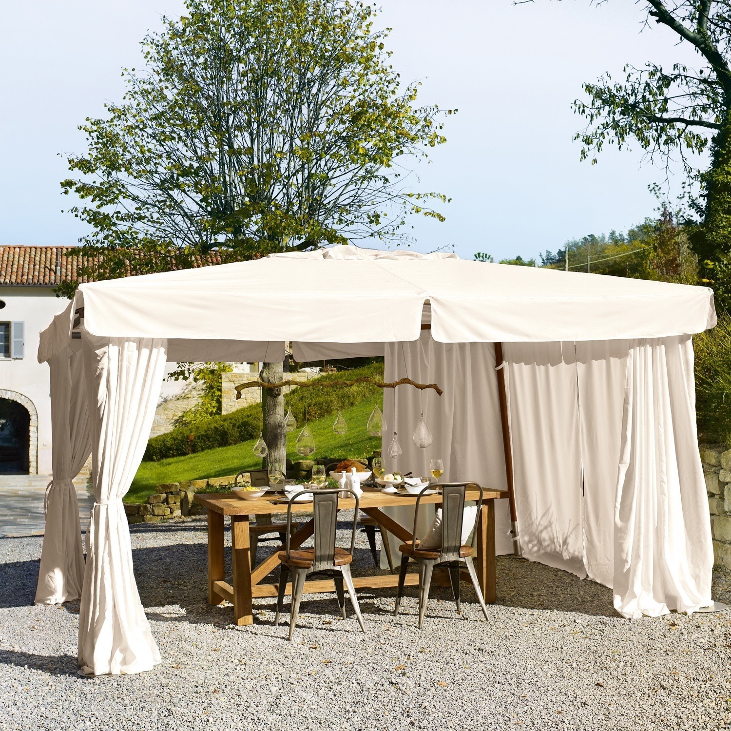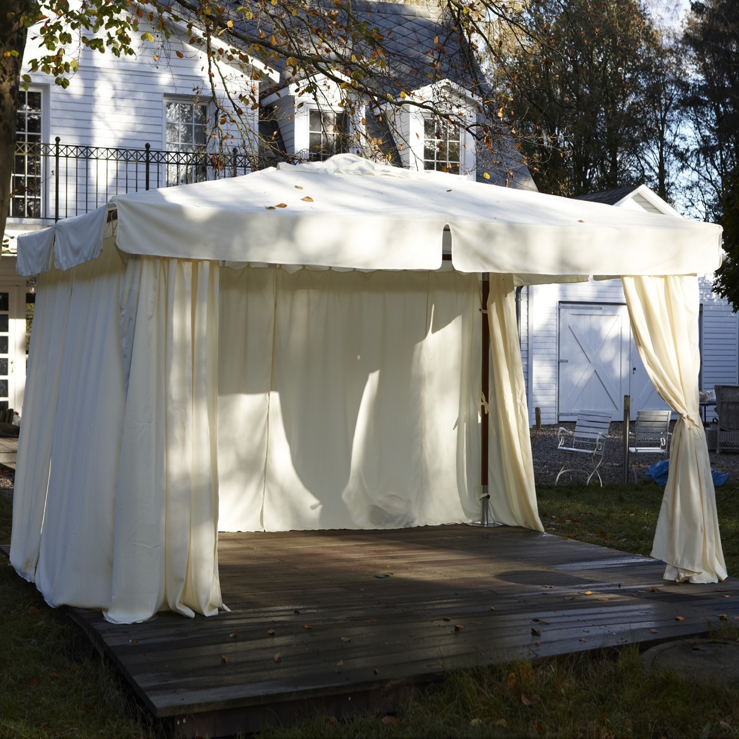Ein Garten-Pavillon der Luxusklasse, den wir in zwei eleganten Farben anbieten. Trotz der stattlichen Größe gestaltet sich der Aufbau durch die praktische ‘Sonnenschirm-Konstruktion’ ganz unkompliziert. Die Außenpfosten und das Schirmgestänge sind aus hochwertigem Eukalyptusholz. die Bespannung und die Seitenteile aus robustem Olefin/100% Polyester, das Schmutz und Wasser abweist und Ihnen und Ihren Gästen auch bei Regen Schutz bietet.
