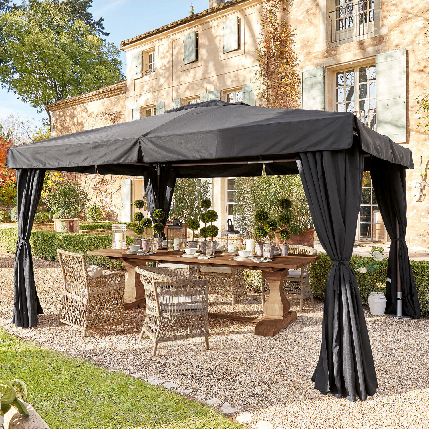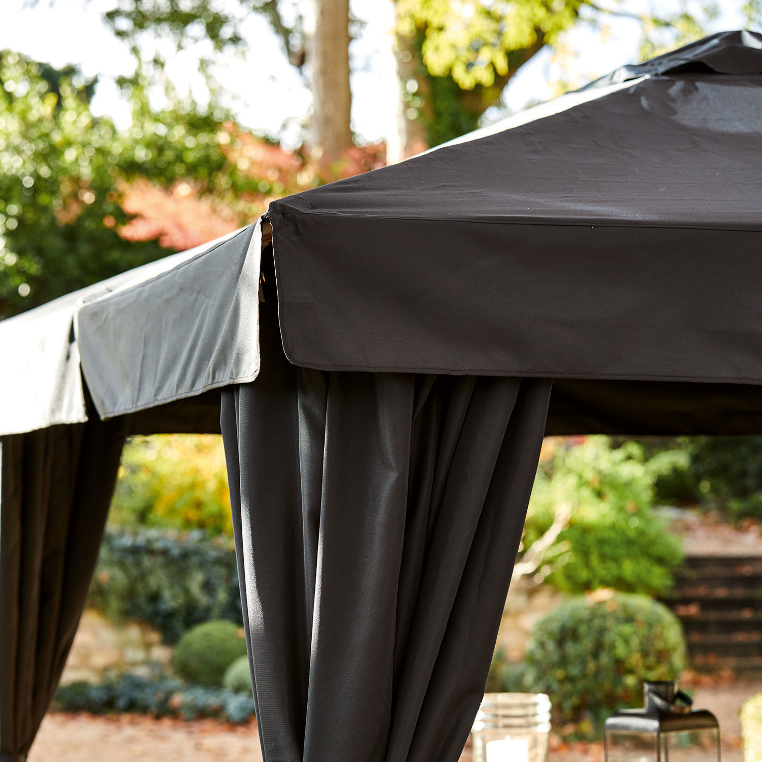 Ein Garten-Pavillon der Luxusklasse, den wir in zwei eleganten Farben anbieten. Trotz der stattlichen Größe gestaltet sich der Aufbau durch die praktische ‘Sonnenschirm-Konstruktion’ ganz unkompliziert. Die Außenpfosten und das Schirmgestänge sind aus hochwertigem Eukalyptusholz. die Bespannung und die Seitenteile aus robustem Olefin/100% Polyester, das Schmutz und Wasser abweist und Ihnen und Ihren Gästen auch bei Regen Schutz bietet.