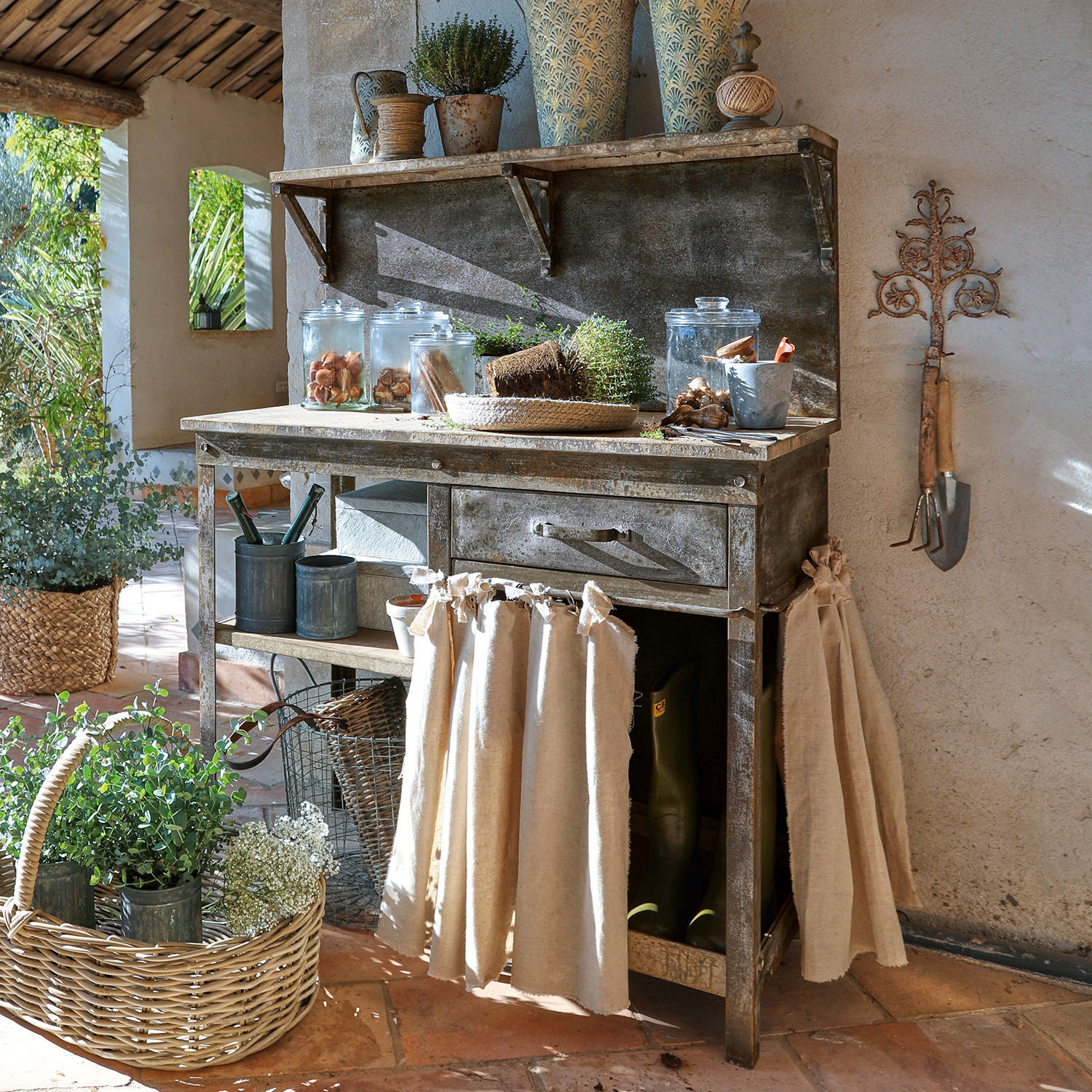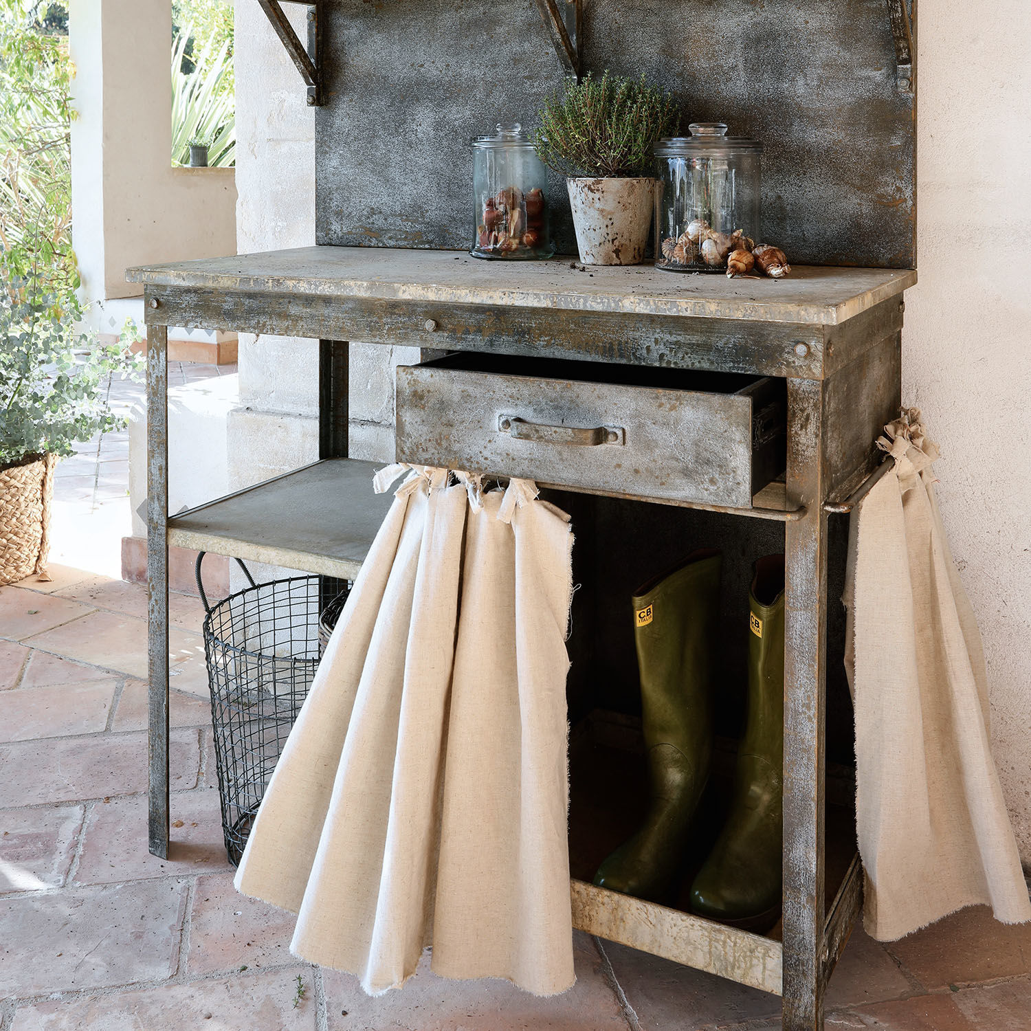 Dieses Schmuckstück im historischen Look legt Ihnen alles zu Händen: Der Pflanztisch ist buchstäblich zum Gärtnern geschaffen. Er besteht aus solidem Eisen und bietet mit seinen komfortablen Ablagemöglichkeiten für Ihre Pflanz- und Gartenutensilien beste Möglichkeiten für eine entspannte Tätigkeit. Unter der Arbeitsfläche befindet sich eine Schublade, in der Sie Gartenhandschuhe, Saatgut und kleine Gegenstände aller Art perfekt verstauen können. Auf dem Ablagebrett darunter lassen sich Töpfe, Blumenerde, Harken und ähnlicher Gartenbedarf platzieren. So liegt alles am rechten Fleck und ist stets griffbereit. All ihre Pflanz- und Umtopfarbeiten verrichten Sie ganz bequem. Und auch, wenn er gerade nicht im Gebrauch ist, zeigt sich der schmucke Pflanzentisch als stilvolles Möbelstück: Sein Finish wird in einem aufwendigen Prozess von Hand gefertigt und gibt ihm einen edlen Antik-Look. Hinzu kommt sein Leinengardine, der mit Bindebändern befestigt ist und den unteren Bereich des Tischs bei Bedarf verhüllen kann. Er lässt sich aber auch, je nach Wunsch, komplett entfernen. Freuen Sie sich mit diesem Tisch auf Komfort und Stil, so wie Sie es sich wünschen!