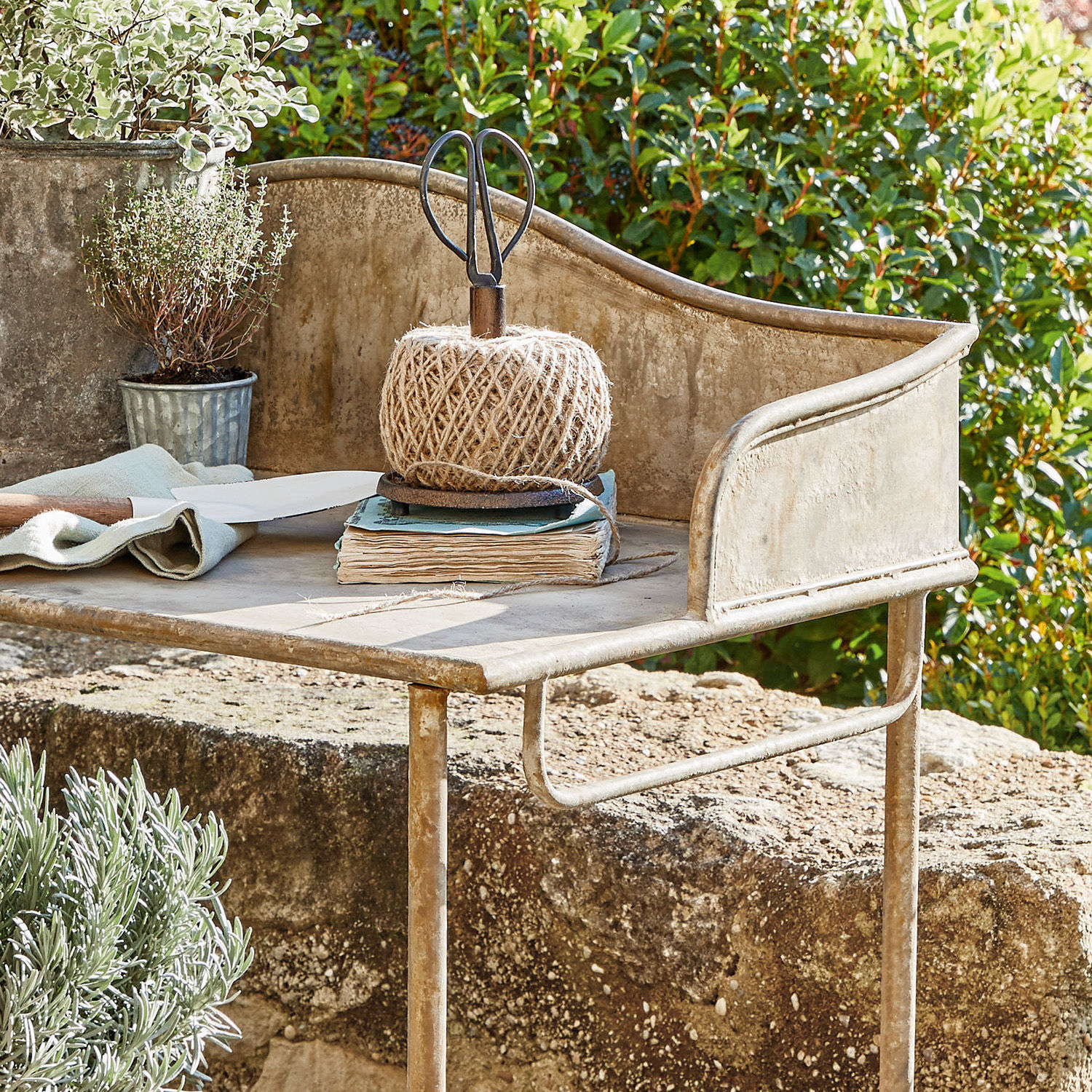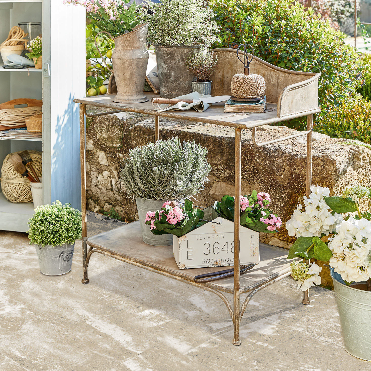 Ein absolutes Must-Have für Garten und Terrasse ist dieser charmante Pflanztisch. Seine Eisenkonstruktion sorgt nicht nur für eine ansprechende Ästhetik, sondern auch für Langlebigkeit und Stabilität. Er ist wetterfest, hat mit starker Sonneneinstrahlung oder Frost keinerlei Probleme. Auf der breiten Arbeitsfläche wird das Umtopfen und Pflegen der Pflanzen zum Kinderspiel und im unteren Drittel findet sich eine großzügig bemessene Ablagefläche für Töpfe, Pflanzen, Werkzeug und Utensilien. An den Seiten ist der Tisch mit Henkeln ausgestattet, die ebenfalls behängt werden können.