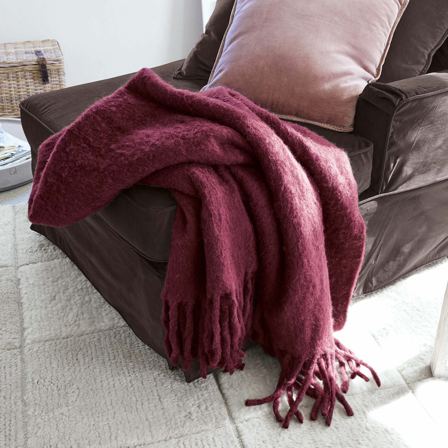 Schon der Anblick dieses wunderbaren Plaids erweckt Kuschelfreude. Fast könnte man meinen, das neue Lieblingsstück wäre eine voluminöse Filzdecke. Doch beim genauen Hinsehen zeigt die Decke ihr schönes Gewebe aus einer Acryl-Wollmischung – ein flauschig weicher Traum. Dafür sorgt vor allem der hohe Kunstfaser-Anteil, denn Stoffe aus reiner Wolle sind nicht so weich und kratzen meist auf der Haut. Im Design übt sie sich in modischer Zurückhaltung, einzig die langen Fransen an den schmalen Kanten sorgen für einen schmückenden Akzent. Das macht das Textil zu einem besonders vielseitigen Wohnaccessoire – auf der Couch, als Tagesdecke auf dem Bett oder als Wärmespender auf der Terrassenlounge. Durch die kräftige Farbnuance setzt das Plaid einen auffallenden Farbtupfer und harmoniert ideal mit klassischen bis designorientierten Wohnkonzepten.