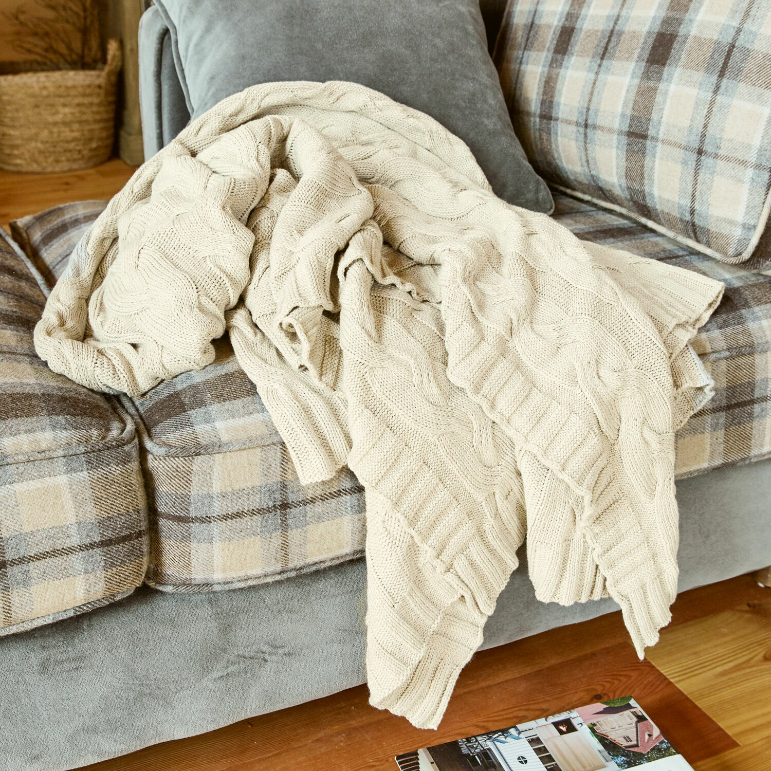 Sie ist überall, die Sehnsucht nach Wärme und Gemütlichkeit – auch in der Wohnraumgestaltung. Da darf ein edles Wohlfühlaccessoire wie dieses Plaid nicht fehlen. Denn eine hübsche Decke lässt ein Wohn- oder Schlafzimmer gleich viel wohnlicher wirken. Zugleich bietet das Textil alles, was jetzt Trend ist: Ein dekoratives, flach gestricktes Jacquard-Zopfmuster, einen dezenten Naturton und eine natürliche Qualität. Baumwolle ist von Natur aus atmungsaktiv und temperaturausgleichend und verwöhnt so mit angenehmem Wohlfühlklima. Dazu kommt die weiche Haptik, die zum Einkuscheln einlädt. Da das Gestrick nicht zu voluminös verarbeitet ist, ist das Plaid das ganze Jahr über einsetzbar. Jetzt müssen Sie sich nur noch Ihren Lieblingsplatz aussuchen, sich in die Strickdecke einhüllen und Ihre Mußestunden bei einer Tasse Tee genießen. Mit der Kissenhülle Nr. 19869 entsteht ein perfektes Set für Ihre individuellen Wohnideen.