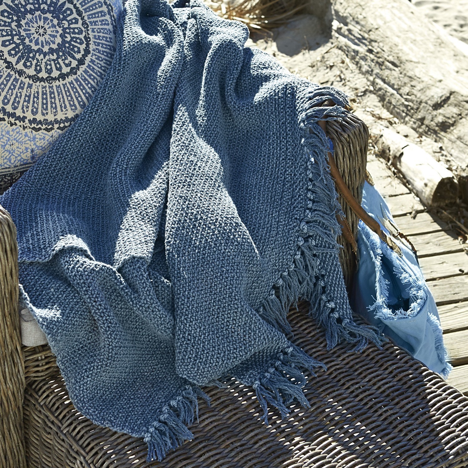 Was gibt es Schöneres, als sich behaglich in seine Decke einzurollen und den Abend genüsslich ausklingen zu lassen? Die schnörkellose Gestalt dieses Plaid macht es auf der Reise und Daheim zum universellen Begleiter. Dieses dicke und sehr weiche Plaid hat eine griffige, dicke Struktur, sorgt für wohlige Wärme und macht auch kühlere Abende zum kuscheligen Genuss. Die kräftige Farbgebung in sommerlichem Blau lässt sich mit zahlreichen Farbtönen kombinieren und bringt sommerliche Frische in Ihr Zuhause. Der grobe Baumwollstoff ist im Washed-Look, wodurch die grobe Oberflächenstruktur noch besser zur Geltung kommt. Geknotete Fransen zieren an zwei Seiten den Rand des Plaids und sorgen zugleich dafür, dass es nicht ausfranst