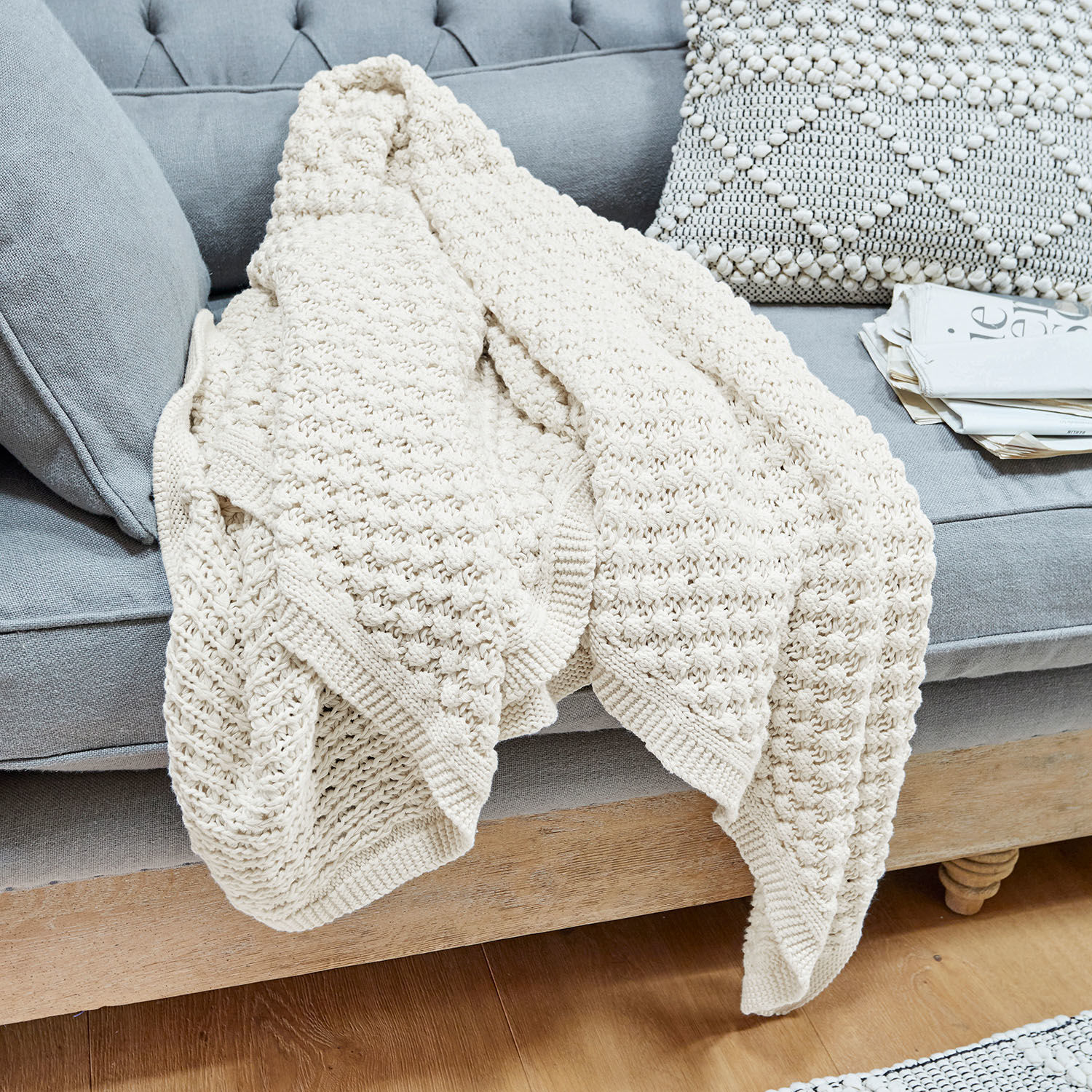 Als schmückendes Wohnaccessoire die Couch oder den Sessel in Szene setzen, eine Stilrichtung unterstreichen oder einfach nur als gemütlicher Wärmespender fungieren – das sind nur einige Möglichkeiten, die Plaids so unverzichtbar machen. Denn sie sind wahre Allroundtalente, die Ihren kreativen Wohnideen viel Ausdruck verleihen. Dieses edle Strickplaid überzeugt nicht nur mit seiner spannenden Textur, sondern auch mit seinem fantastischen Komfort. Die lebendige Strickstruktur, auch Popcorn-Muster genannt, ist ein besonders aktueller Trend und verleiht der Decke eine faszinierende Optik. Dabei setzt die gerippte Abschlussblende rundum einen wirkungsvollen Rahmen. Durch die naturreine, weiche Baumwollqualität ist das Plaid ein Genuss auf der Haut. Schmiegen Sie sich ein in diese Decke und genießen Sie die wohlige Wärme. Zurückhaltend in der Farbgebung passt sie sich jedem Wohnkonzept perfekt an.