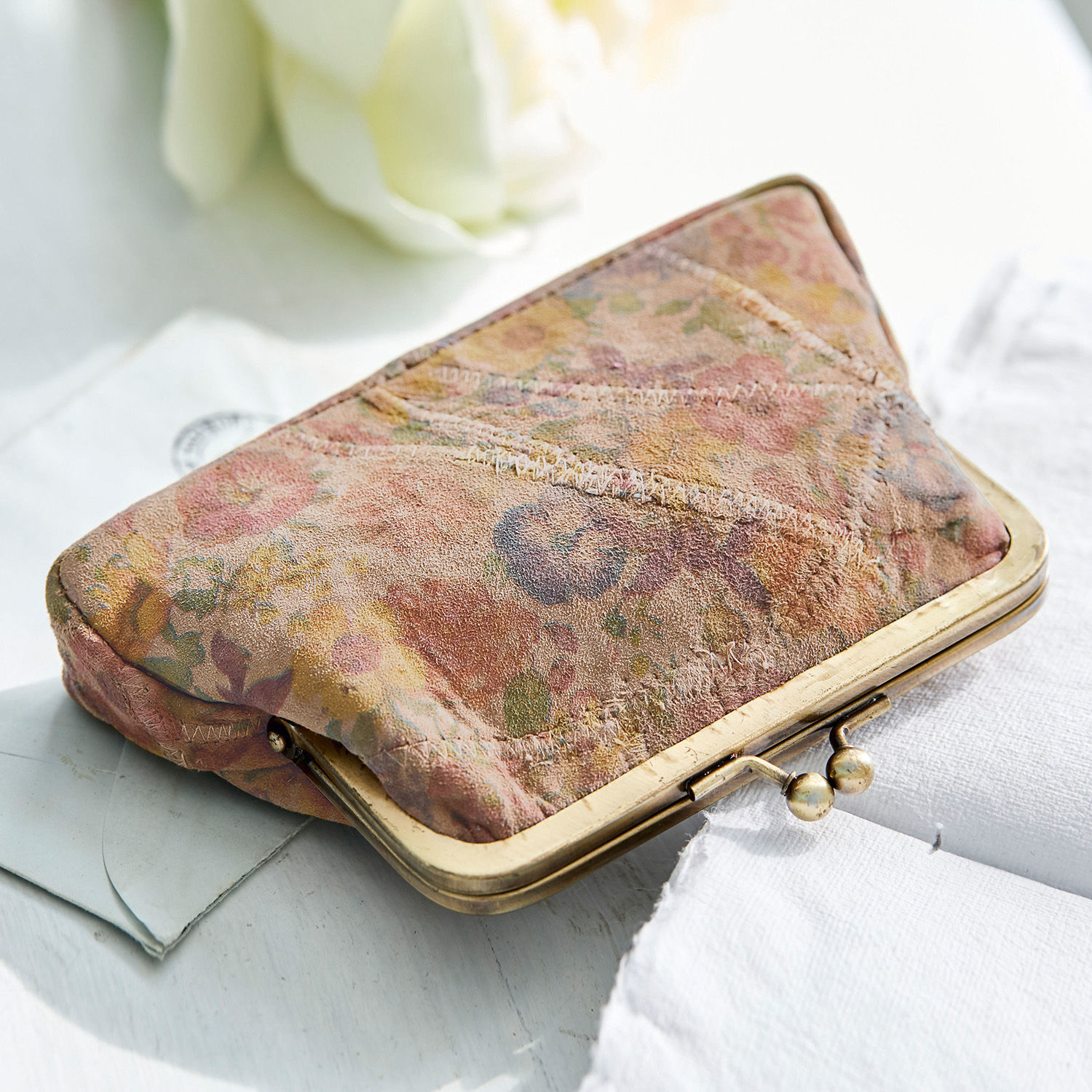 Eine Prise Retro und ganz viel Romantik bietet diese kleine Tasche aus weichem Ziegenveloursleder. Schon der messingfarbene Metallbügel mit Klappverschluss erinnert an ein altes Portemonnaie. Außen sorgt der hübsche Blütendruck für zauberhaften Charme und zieht alle Blicke auf sich. Innen ist das Täschchen mit einem Baumwollfutter ausgestattet. Bei so viel Stil geht der Blick auf Nachhaltigkeit und Umweltbewusstsein dennoch nicht verloren. Denn der Korpus besteht ausschließlich aus wiederaufbereiteten Lederresten, die in meisterhafter Feinarbeit von Hand aneinander genäht sind. Das Leder ist qualitativ besonders hochwertig und sorgt für eine wunderbare Geschmeidigkeit und ein feines Finish. Ob als Schminktasche, Geldbeutel oder Neccessaire für Ihre ganz privaten Utensilien – dieses Ledertäschchen meistert alle Aufgaben mit Bravour und passt in jede Handtasche. Ein edles Accessoire und das perfekte Geschenk für Frauen, die eine Vorliebe für das Besondere haben.
