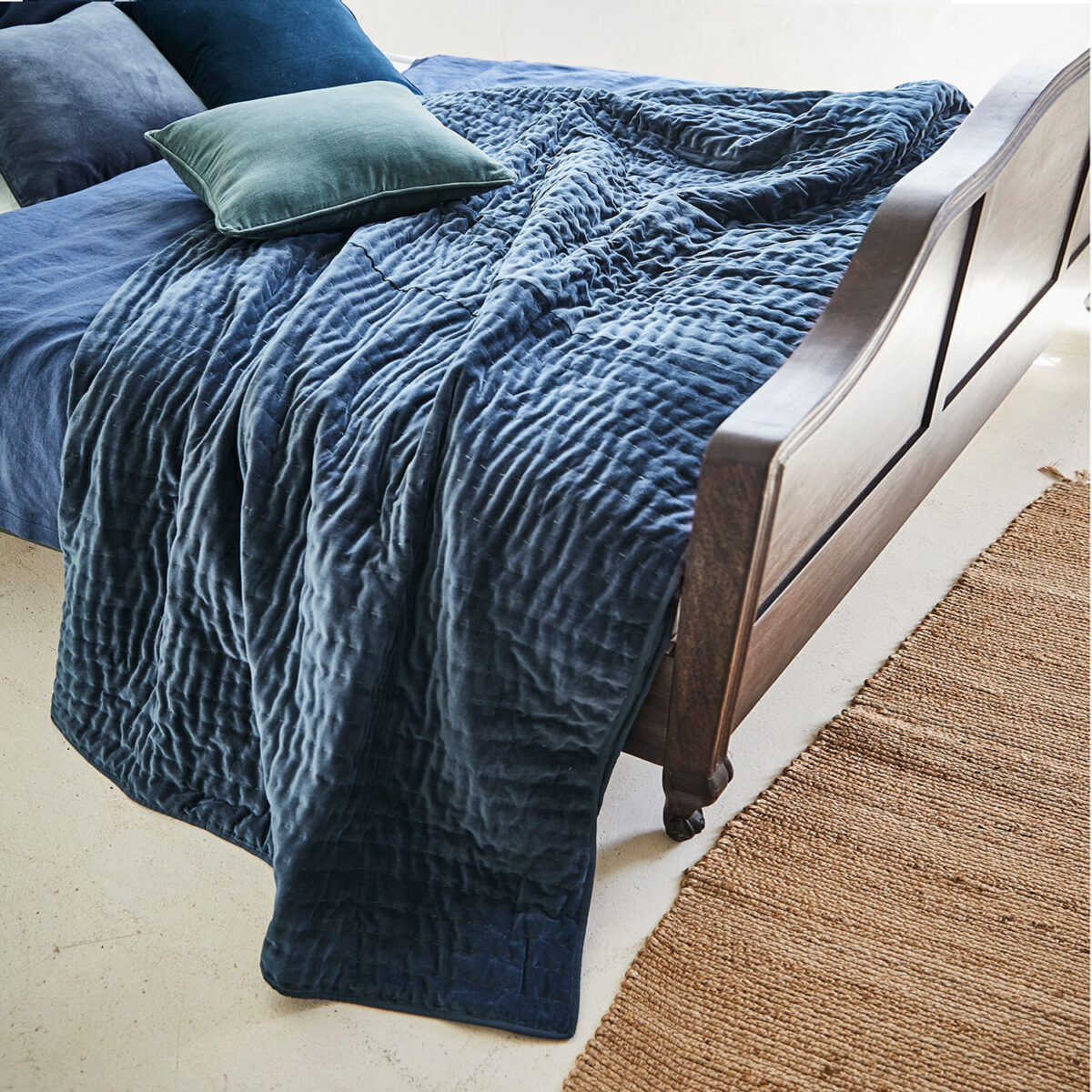 Egal ob French-Chic, Landhaus-Stil oder Scandi-Style – zu einem guten Interieur-Konzept gehören neben ausgesuchten Möbelstücken auch passende Accessoires, die eine wohnliche Atmosphäre schaffen. Dieser wunderbare Quilt könnte schnell ein Lieblingsstück in Ihrem Zuhause werden. Mit seinem schlichten Design und spannenden Spiel aus unterschiedlichen Texturen ist er nicht nur ein attraktiver Überwurf für das Bett, sondern verleiht auch die Gemütlichkeit und Wärme, die man sich beispielsweise für entspannte Stunden auf dem Sofa wünscht. Genießen Sie die unvergleichlich weiche Haptik des fein schimmernden Baumwollsamt auf der Oberseite, ergänzt durch die farblich abgestimmte, feine Baumwolle auf der Unterseite. Dazu kommt die typische, leichte Innenwattierung, die dem Quilt eine Extraportion Volumen schenkt. Alle drei Stofflagen sind durch handgestickte Ziernähte perfekt miteinander verbunden. Die sorgfältige Bandeinfassung rundum unterstreicht die hochwertige Verarbeitung und rundet das exquisite Bild ab. Ein Wohntextil von edler Noblesse und zeitloser Schönheit – auch nach vielen Jahren werden Sie noch Ihre Freude daran haben.