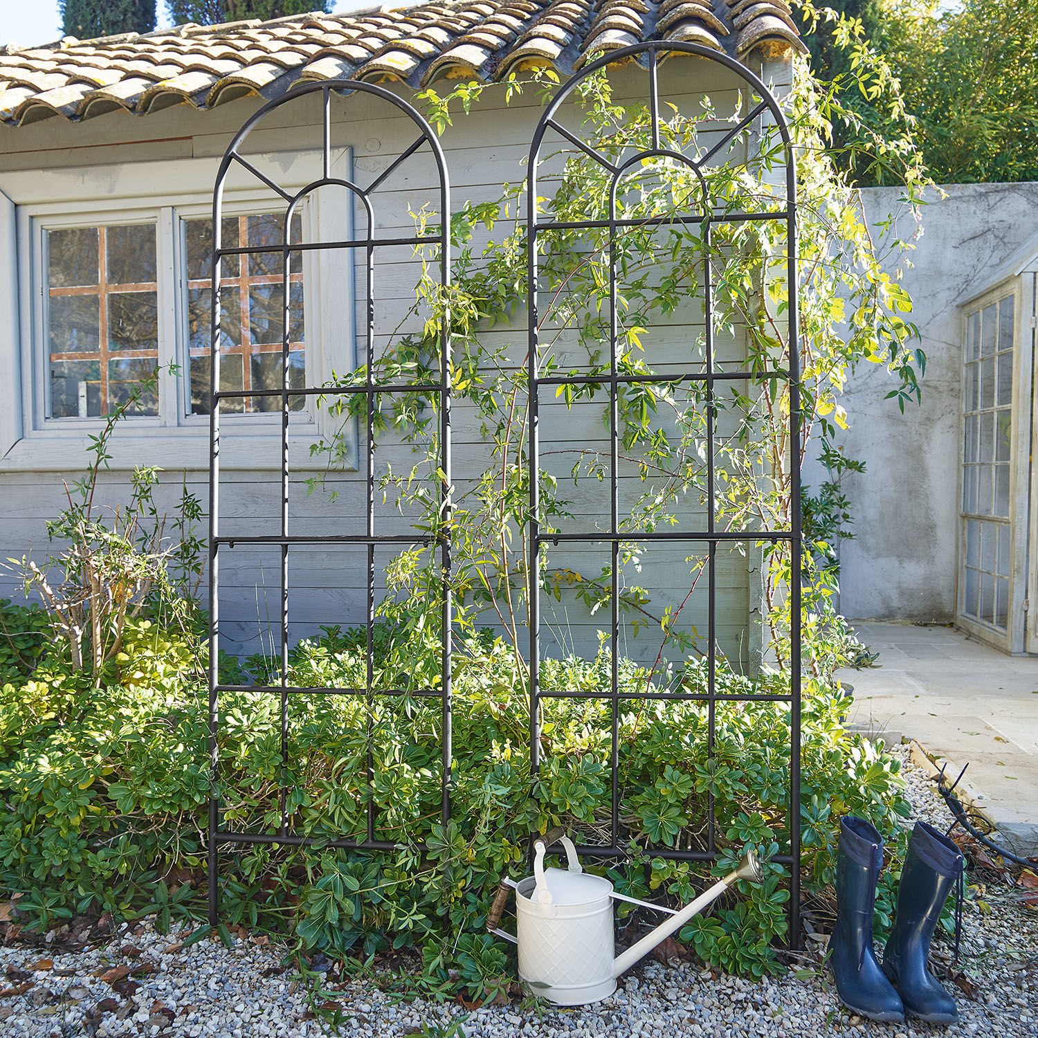 Ein traumhaft schönes Design aus stabilem und langlebigen Eisen. Das edle, hohe Rankgitter kommt gleich im Doppel zu Ihnen, sodass Sie besonders viele Gestaltungsmöglichkeiten haben. Es bietet eine wunderbare Kletterhilfe für Rosen und andere blühende Pflanzen, wodurch Balkon, Terrasse und Garten stilvoll aufgewertet werden. Die beiden hübschen Accessoires lassen sich auch rein dekorativ verwenden, vielleicht mit Lichterketten oder hängenden Windlichtern geschmückt. Die eleganten Modelle können eine geschmackvolle, optische Trennung verschiedener Bereiche schaffen. Machen Sie Ihre Outdoor-Oase zum grünen Paradies und freuen Sie sich mit diesem attraktiven und nostalgischen Duo auf ein ganz persönliches Paradies im Grünen.