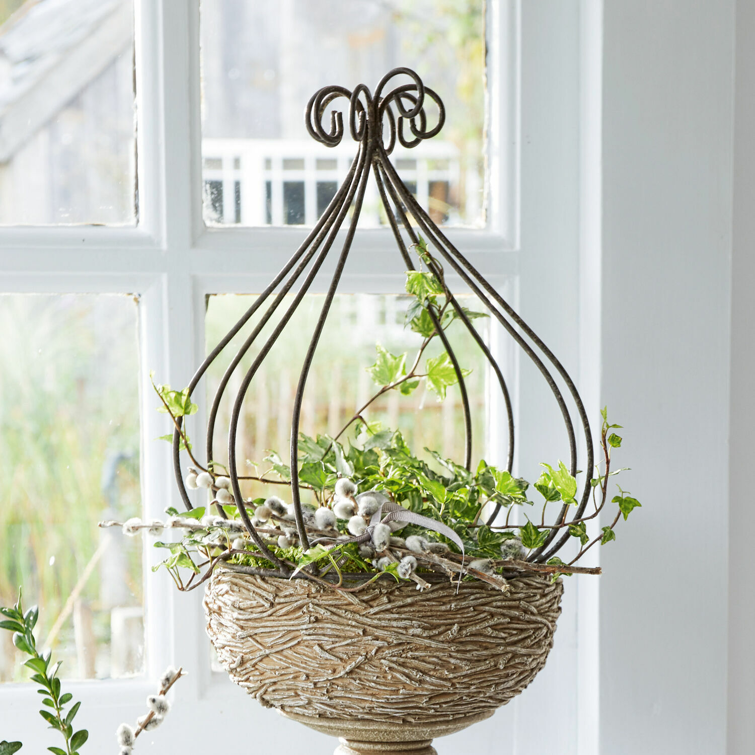 Dass praktische Dinge auch sehr stilvoll sein können, beweist diese Rankhilfe aufs Schönste. Denn sie glänzt nicht nur mit ihrer schwungvollen Gestalt, sondern auch mit ihren antiken Reizen. Hochwertig gefertigt aus Eisen ist sie mit einem matten Rost-Finish versehen, das die Spuren der Vergangenheit zitiert. Denn gealtert übt sie eben einen ganz besonderen Charme aus. Ein ästhetisch wertvolles Accessoire, das sich in romantischem Vintage-Ambiente perfekt einfügt – und auf der Terrasse aber auch im Raum viel Wirkung entfaltet. Gemeinsam mit der Topfblume Ihrer Wahl entsteht eine außergewöhnlich schöne Inszenierung, die alle Blicke auf sich zieht. Natürlich bildet das Rankgitter auch eine geeignete Bühne für fantasievolle Arrangements, zum Beispiel mit Kerzen, liebevollen Dekostücken und frischen Blühern – ganz nach Anlass und Saison.
