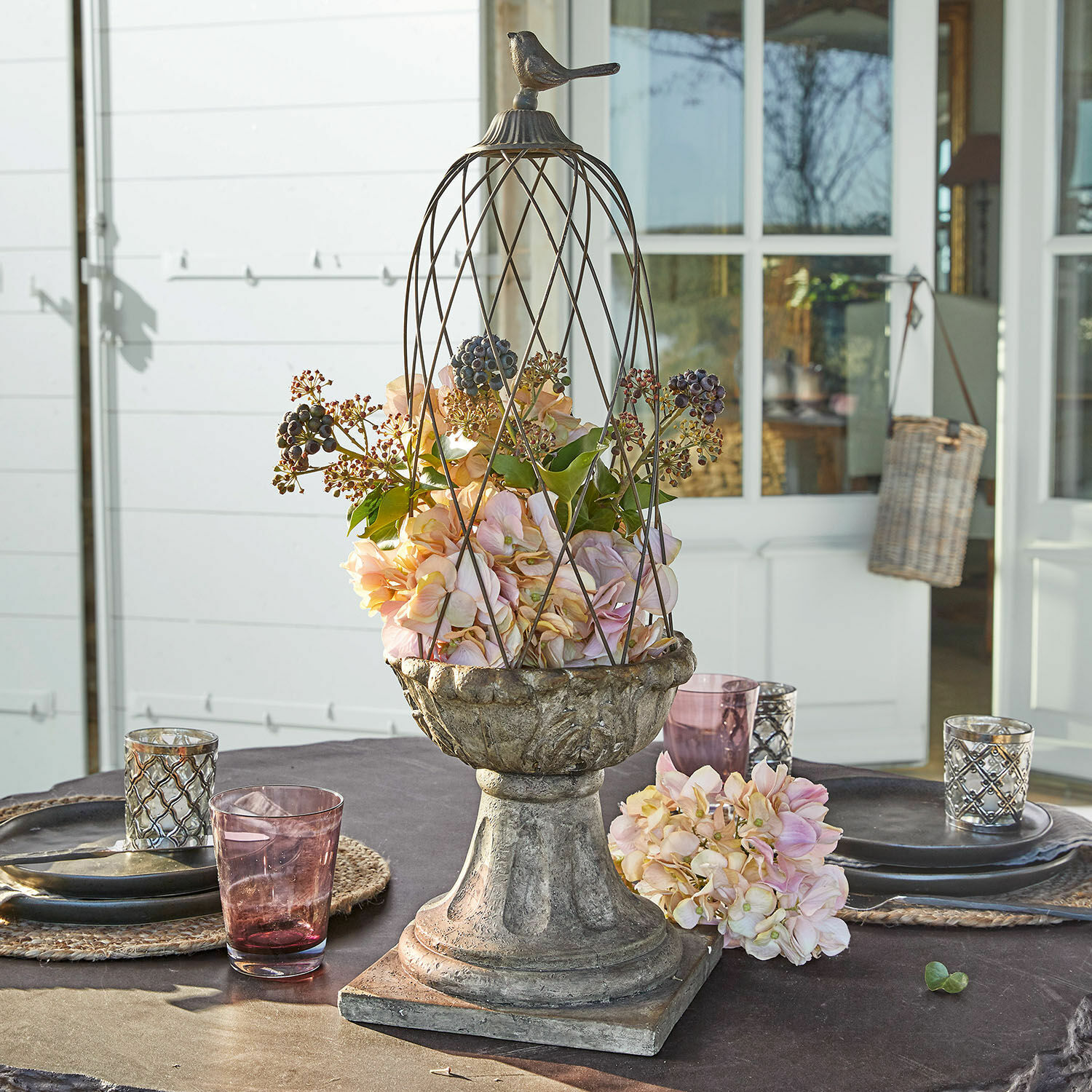 Verleihen Sie Ihrer Terrasse oder dem Garten nostalgischen Charme. Bestehend aus Amphore und Rankgitter setzt dieses Set nicht nur optisch einen außergewöhnlichen Akzent, sondern verleiht auch Ihren hübschen, rankenden Sommerblühern und kletternden Grünpflanzen einen stilvollen Rahmen. Schon die liebevolle Gestaltung aus Kunststein avanciert die standfeste Blumenamphore zu einem echten Schmuckstück. Dazu kommt das abnehmbare, filigran geschwungene Rankgerüst aus Eisen, welches von einer zauberhaften Vogelgestalt gekrönt wird. Und weil das Duo in gealterter Anmutung besonders reizvoll wirkt, wurde es mit einem antiken Finish veredelt. Ein Gartenaccessoire, das alle Blicke auf sich zieht und vielseitig einsetzbar ist. So kann es den Rand eines Weges eindrucksvoll säumen oder die Treppe zum Terrassenbereich stimmungsvoll beleben.