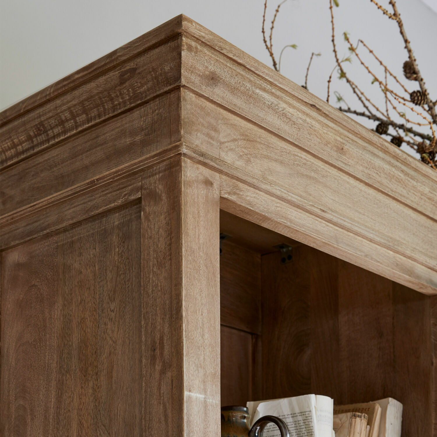Wer Bücher liebt, wird beim Anblick dieses Regals ein angenehmes Kribbeln im Bauch verspüren und schon in Gedanken mit dem Einräumen beginnen. In diese Fächer kommen die Sachbücher, dort die Romane, daneben die Reiseführer usw. Die gleich großen Fächer des Regals geben Ihrer privaten Bibliothek Struktur und bilden zugleich den ruhigen Rahmen für die kunterbunten Buchrücken. Aber natürlich dürfen sich in diesem Regal auch geliebte Sammlerstücke, Erinnerungen an besondere Urlaube oder schöne Momente, Ihre Lieblingsfotos und andere Deko-Objekte zur Schau stellen und Ihrem Wohnbereich die persönliche Note geben. Dafür bietet Ihnen das Regal die stattliche Anzahl von einem ganzen Dutzend Fächern. Doch nicht nur aufgrund seiner Größe wird das Regal eine imposante Raumwirkung entfalten, auch die feine Schreinerarbeit und das edle Mangoholz leisten ihren Beitrag dazu. Das Regal wurde ganz im Stil eines traditionellen Bücherschranks mit einem massiven Sockel versehen und mit einem fein geschnitzten Reliefkranz geschmückt, während das Mangoholz für Beständigkeit und Langlebigkeit steht. Das Regal wurde aber nicht nur nach bester Handwerksmanier gefertigt, sondern das Holz anschließend geölt, was die natürliche Maserung besonders schön zur Wirkung bringt.
