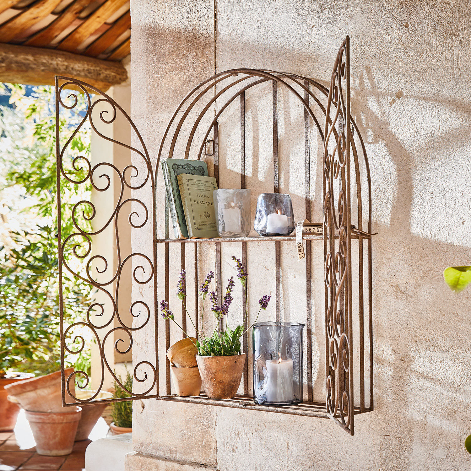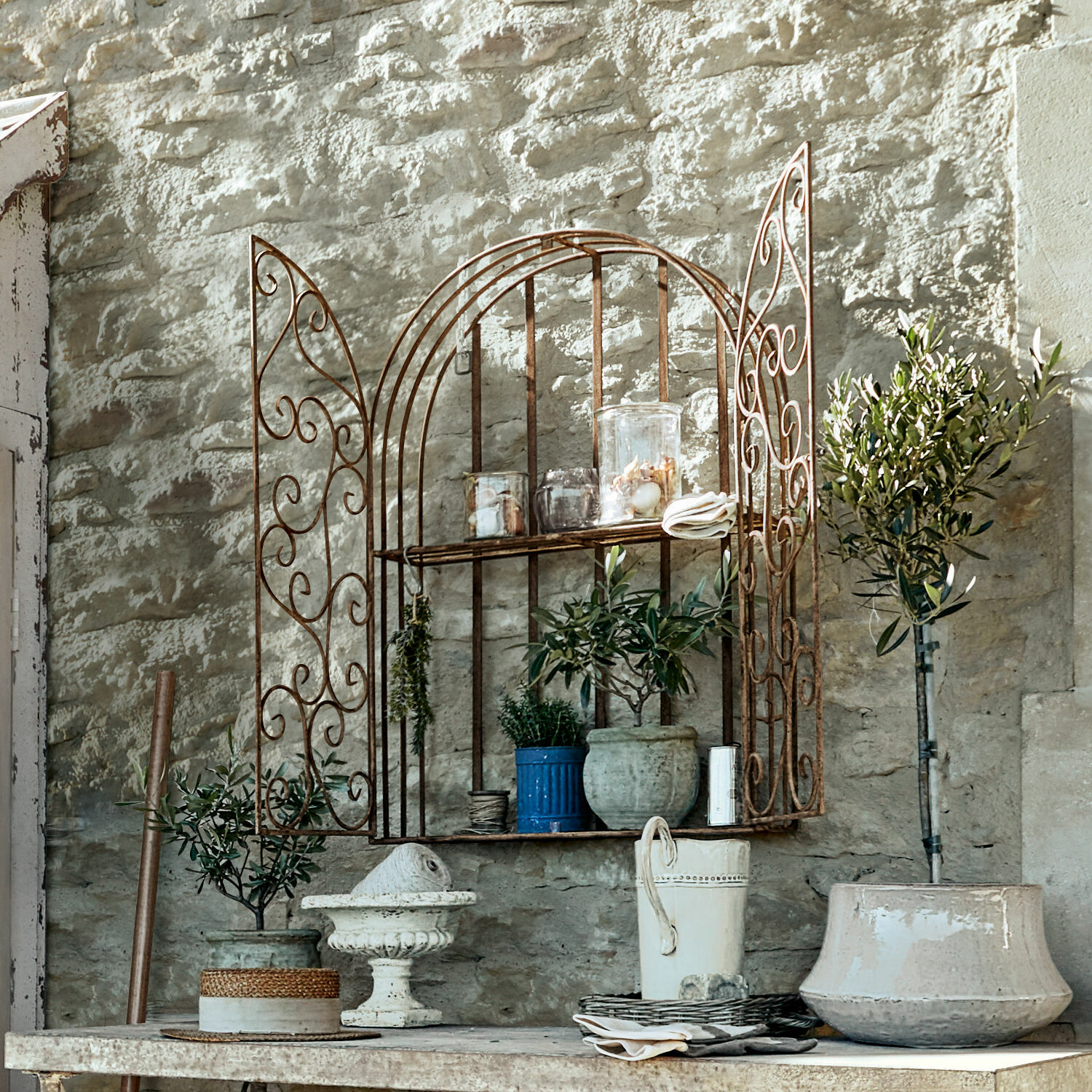Möbel aus kunstvoll geschmiedetem Eisen gehören zum Repertoire bekennender Romantiker. Das Spannungsfeld zwischen der Schlichtheit des Materials und den stilvoll geschwungenen Formen steht für jene Originale französischer Vorbilder, die auch dieses Regal ausstrahlt. Gerade für draußen eignet sich der robuste Werkstoff ideal, denn Sonne, Kälte oder Nässe können ihm nichts anhaben. Und mit der Zeit gewinnt auch die antike Patina immer mehr an Schönheit. Die Fertigung des Regals stellt höchste Ansprüche an die Schmiedekunst. Dabei erinnert seine Formgebung an einen romantischen Rosenbogen, dessen zwei Regalböden darin elegant zu schweben scheinen. Vollendet wird der Auftritt durch zwei Türen mit kunstvoll gefertigten Ornamenten, die sich dank Schieberegler leicht öffnen und schließen lassen. Zwei Haken auf der Rückseite ermöglichen ein unkompliziertes Befestigen an jede Wand. Ob auf Ihrer Terrasse, Loggia oder auch in Ihrem Eingangsbereich – der antike Charme dieses Regals ist bestechend und wird schnell zum ästhetisch wertvollen Blickfang. Was gibt es nun Schöneres, als dem Eisenmöbelstück mit verschiedenen Accessoires das i-Tüpfelchen aufzusetzen. Windlichter, Grünpflanzen oder Vasen sind nur einige Möglichkeiten – Ihren Ideen sind keine Grenzen gesetzt.