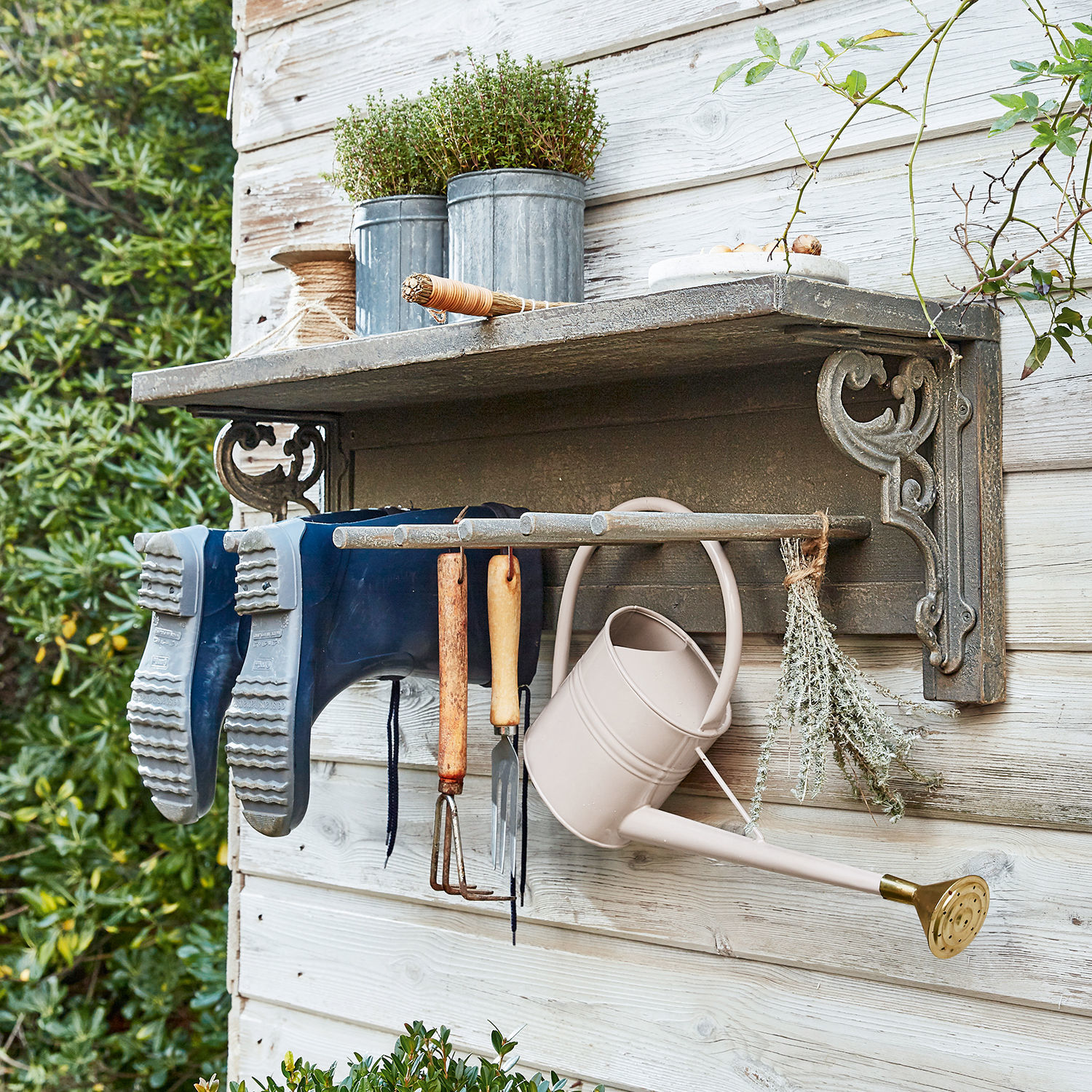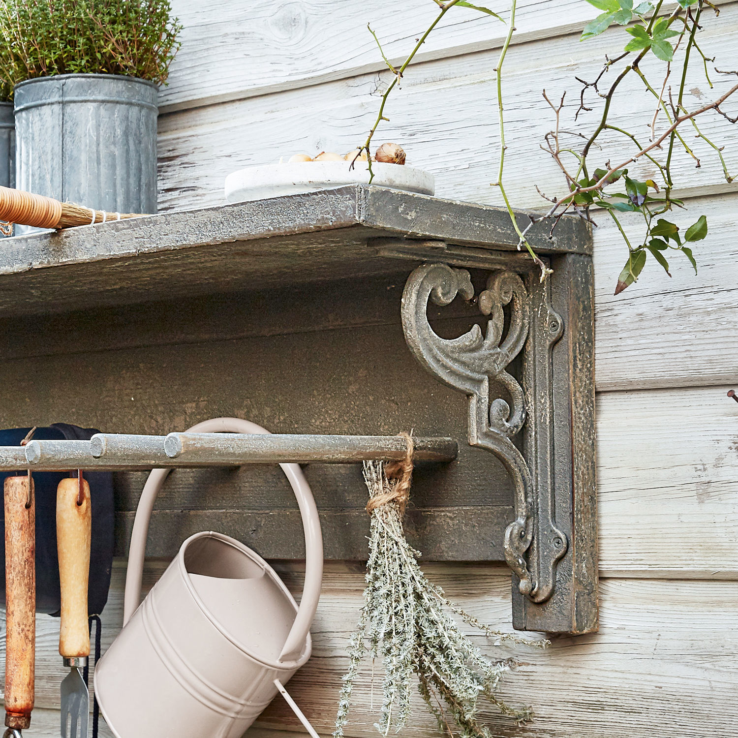 Nützlich, langlebig und vielseitig verwendebar – dieses stilvolle Wandregal ist ein echtes Lieblingsstück. Es ist nachhaltig und besteht aus wiederaufbereitetem Kiefernholz. Hinzu kommt ein zierender Stützwinkel aus Gusseisen: Dieser ist kunstvoll gestaltet, sodass das Regal schön nostalgisch in der Optik ist. Durch die Wandanbringung sparen Sie Platz – ideal im Gartenhaus, auf der Terrasse oder im Flur. Das wertvolle Modell eignet sich perfekt, um daran Gartenstiefel aufzuhängen. Diese werden einfach kopfüber eingehängt. Doch auch Handtücher, Gartengeräte oder Dekoratives wie Kränze und Trockensträuße finden hier ein hübsches Plätzchen. So macht es direkt Spaß, Ordnung zu halten. Erleben Sie ein schmückendes und gleichzeitig sehr nützliches Accessoire mit Vintage-Charme für Ihr Zuhause.