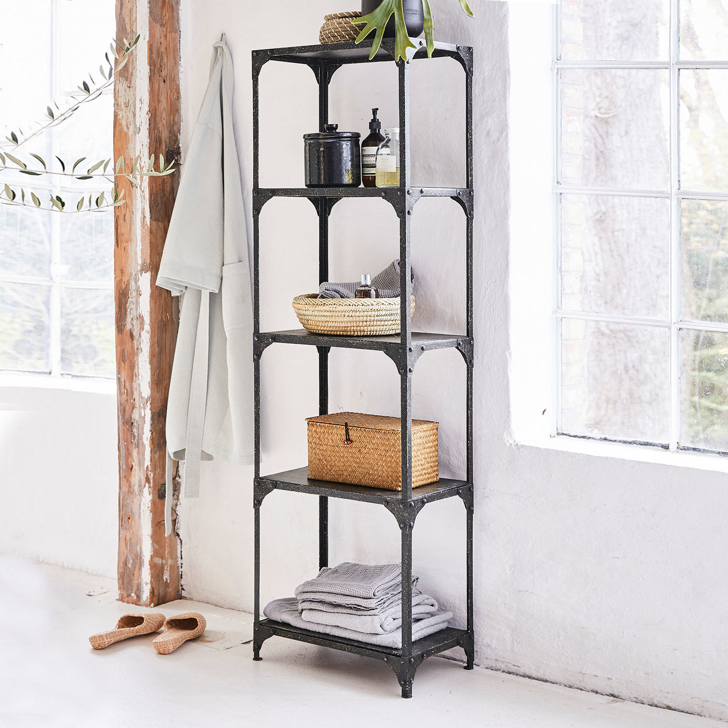 Im Trend sind Möbel und Accessoires, die noch mit einem Bein in der Vergangenheit stehen und ein bisschen vom Flair vergangener Zeiten in die Gegenwart tragen. Dieses Metallregal mit antikem Finish könnte früher gut im Kontor eines Fabrikanten gestanden und Aktenordnern mit wichtigen Papieren einen sicheren Platz gegeben haben. Ordentlich aufgeräumt, aber übersichtlich und mit einem Griff zur Hand. Und mit genau diesen Eigenschaften wird sich das Regal auch in Ihren vier Wänden nützlich machen. Zum Beispiel im Badezimmer, wo es Handtüchern, Shampoo, Lotion und anderen Badutensilien einen stilvollen Platz bietet. wo Sie Ihrem Bad aber auch mit ausgewählten Deko-Objekten und Grünpflanzen die individuelle Note geben und zugleich für eine anheimelnde Atmosphäre sorgen können. Aber auch im Home-Office wird sich das Regal von seiner ebenso dekorativen wie nützlichen Seite zeigen. Oder gibt es bei Ihnen vielleicht wertvolle oder auch witzige Sammler-Objekte? Auch diese können perfekt auf den nach allen Seiten hin offenen Regalböden präsentiert werden. Und weil das Regal zwar eine Breite von 50 cm, aber nur eine Tiefe von 29 cm hat, kann es auch in kleineren Räumen und engeren Durchgängen seine Dienste anbieten.