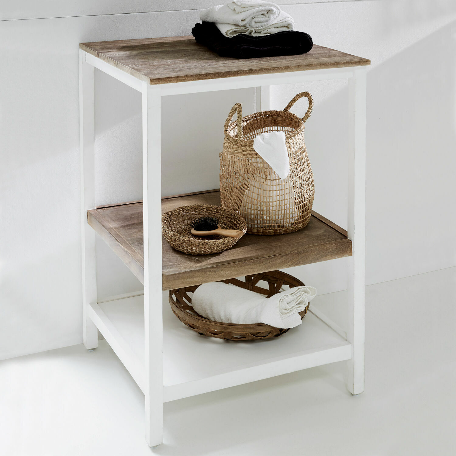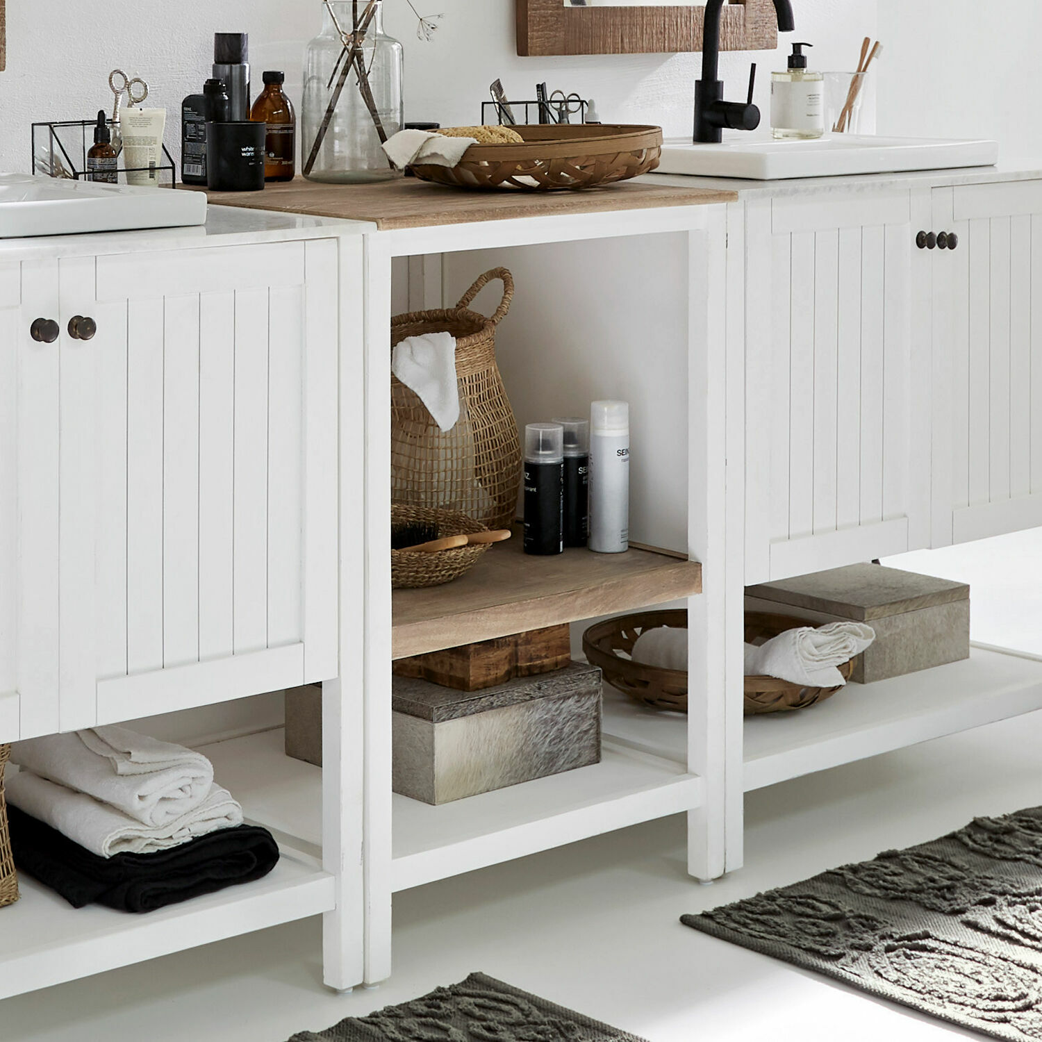 Wenn ein Meister seines Faches am Werk war, dann kann auch ein scheinbar einfaches Möbelstück mit überraschend vielen guten Eigenschaften punkten –dekorativer wie funktionaler Natur. So überzeugt dieses Regal zunächst mit dem hochwertigen Material, das bei ihm zum Einsatz kam: edles Mangoholz. Das ist nicht nur ein sehr robustes und langlebiges Hartholz, sondern auch eines, das sich durch eine besonders schöne Maserung auszeichnet, deren individueller Charakter durch das dezente White-Washed-Finish auf der oberen Abdeckplatte dekorativ betont wurde. Kurz: ein charmantes Möbelstück, das sich wunderbar vielseitig kombinieren lässt. So passt es mit seinem dunkelgrauen Korpus perfekt zu dem noblen Landhaus-Waschtisch (19928) und erweitert das exklusive Ensemble um weitere Ablageflächen. Das Regal lässt sich aber auch prima solo im Bad platzieren, wo es bevorzugt als stilvolle Ablagefläche für Handtücher, aber auch für Körbe mit Dusch- oder Schmink-Utensilien dient. Und natürlich ist das schlicht designte Regal keineswegs auf den Standort Badezimmer festgelegt, sondern macht sich auch in anderen Raumsituationen nützlich, zum Beispiel in der Küche oder im Schlaf- oder Gästezimmer.