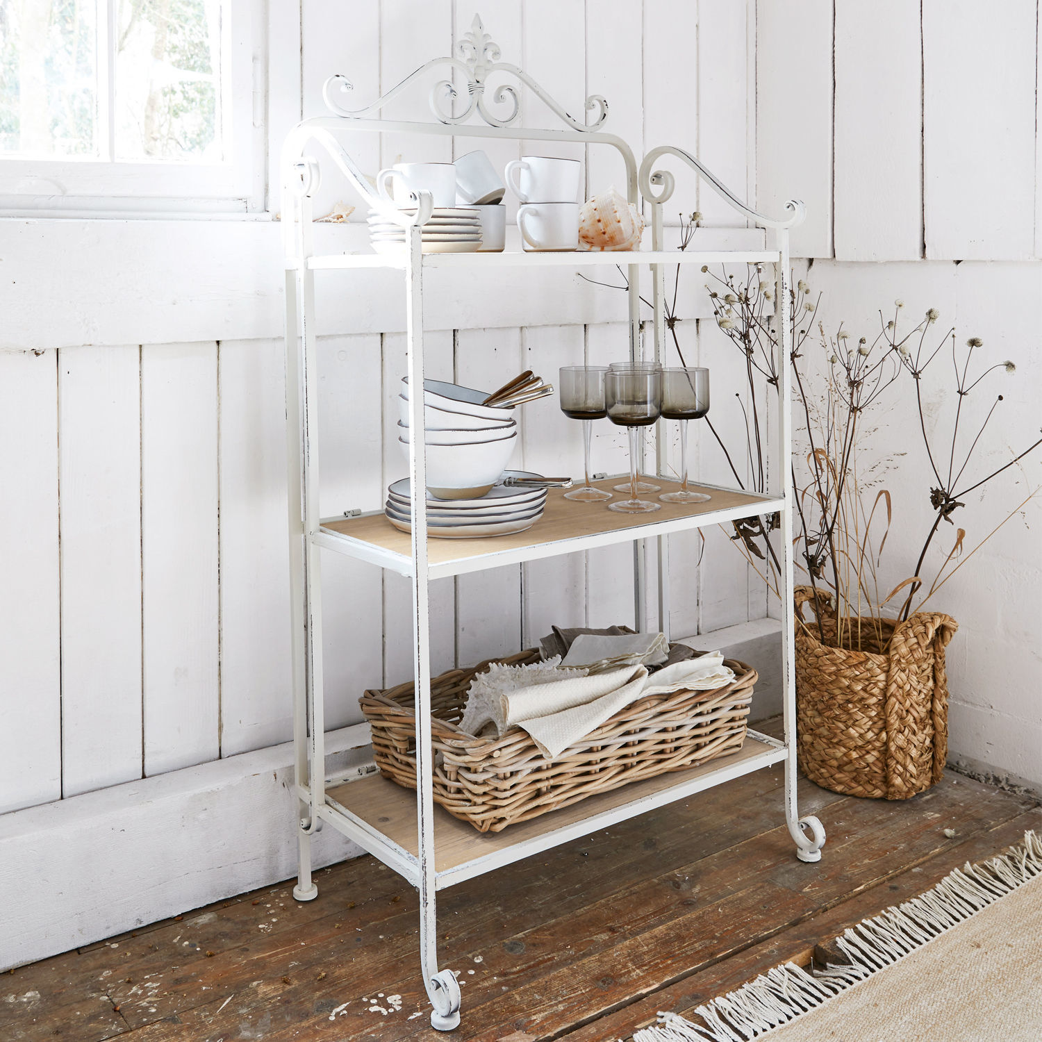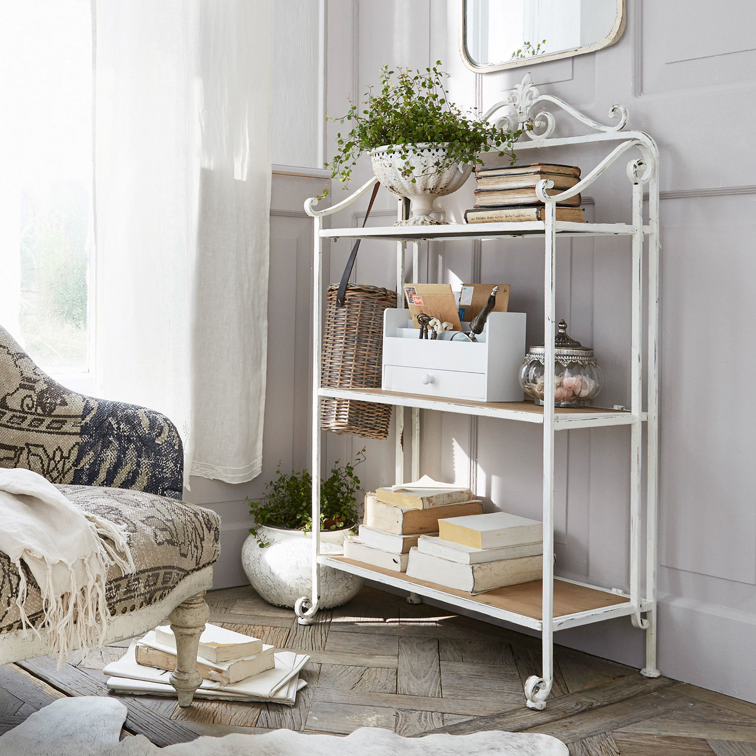 Romantisch anmutender Eisenrahmen mit kunstvoll verschnörkelten Verzierungen. Wunderschönes Finish im Shabby-Stil. Drei Fächer mit stabilen Einlegeböden. Das […]
