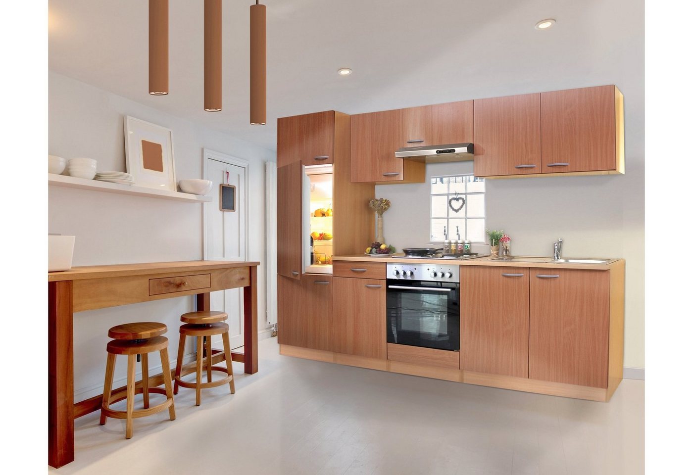 Einen schönen Hingucker stellt die moderne Küchenzeile »Respekta Basic« dar. Diese zeitgemäße Einbauküche erweist sich als ansprechender Blickfang in deiner Küche. Dazu punktet sie mit einer durchdachten Ausstattung. Zum Lieferumfang gehören neben einer Edelstahl-Kochmulde auch ein Kühlschrank, ein Backofen sowie eine Dunstabzugshaube. Weiterhin bekommst du bei diesem Küchenblock mehrere Schränke zum Hängen und Stellen. Diese bieten ausreichend Stauraum für alle Lebensmittel sowie Küchenutensilien. Die melaminbeschichtete Einbauküche punktet weiterhin mit pflegeleichten Oberflächen. Eine echte Bereicherung in allen Punkten stellt die Küchenzeile »Respekta Basic« dar.