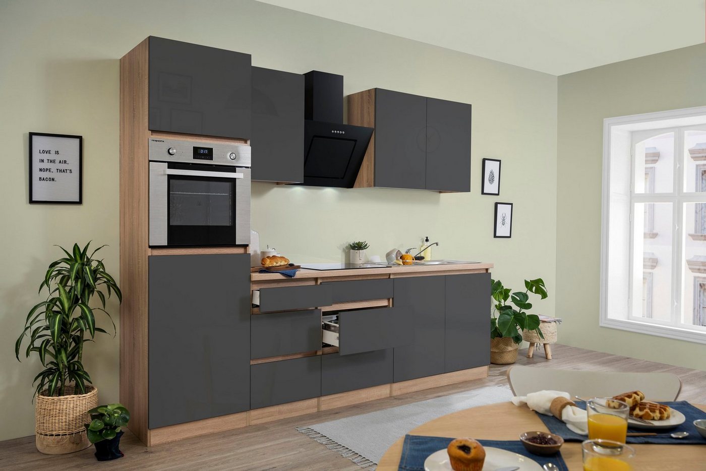 Eine moderne Bereicherung für die Einrichtung ist die Küchenzeile »Boston« inklusive E-Geräte. Fronten mit eingelassener Griffleiste und eine schlichte Farbkombination zeichnen das Design aus. Nach persönlichem Geschmack steht der Küchenblock mit matten oder hochglänzenden Fronten zur Auswahl. Im Spülen- und Unterschrank sowie in den Hängeschränken befinden sich Aufbewahrungsmöglichkeiten für Geschirr und Lebensmittelvorräte. Dank einer Soft-Close-Funktion schließen alle Türen geräuscharm und materialschonend. Mit einem Kühlschrank, Backofen, Dunstabzugshaube sowie Kochfeld bietet die Einbauküche alle wichtigen E-Geräte für den täglichen Gebrauch. Qualitativ überzeugt sie durch eine melaminbeschichtete Oberfläche, die für eine erhöhte Kratzfestigkeit sorgt. Eine geschmackvolle Kücheneinrichtung ist diese Küchenzeile »Boston« inklusive E-Geräte.