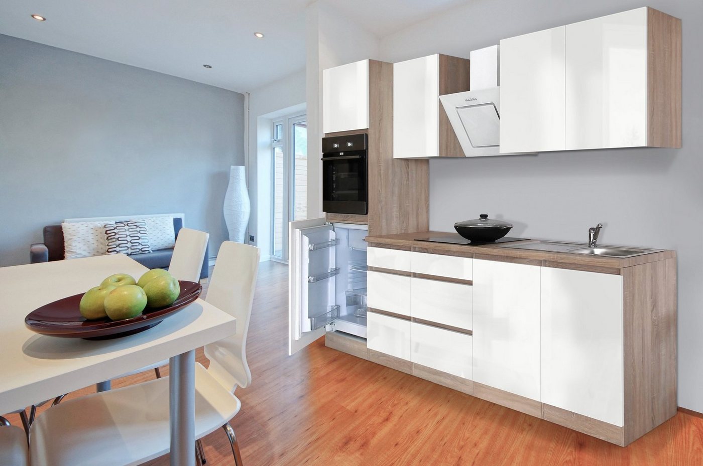 Eine moderne Bereicherung für die Einrichtung ist die Küchenzeile »Boston« inklusive E-Geräte. Fronten mit eingelassener Griffleiste und eine schlichte Farbkombination zeichnen das Design aus. Nach persönlichem Geschmack steht der Küchenblock mit matten oder hochglänzenden Fronten zur Auswahl. Im Spülen- und Unterschrank sowie in den Hängeschränken befinden sich Aufbewahrungsmöglichkeiten für Geschirr und Lebensmittelvorräte. Dank einer Soft-Close-Funktion schließen alle Türen geräuscharm und materialschonend. Mit einem Kühlschrank, Backofen, Dunstabzugshaube sowie Kochfeld bietet die Einbauküche alle wichtigen E-Geräte für den täglichen Gebrauch. Qualitativ überzeugt sie durch eine melaminbeschichtete Oberfläche, die für eine erhöhte Kratzfestigkeit sorgt. Eine geschmackvolle Kücheneinrichtung ist diese Küchenzeile »Boston« inklusive E-Geräte.