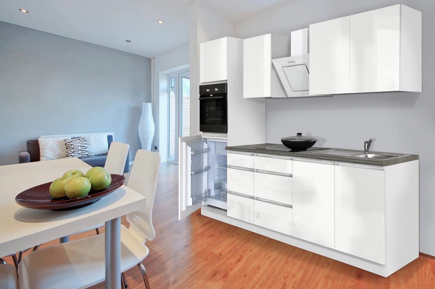 Eine moderne Bereicherung für die Einrichtung ist die Küchenzeile »Boston« inklusive E-Geräte. Fronten mit eingelassener Griffleiste und eine schlichte Farbkombination zeichnen das Design aus. Nach persönlichem Geschmack steht der Küchenblock mit matten oder hochglänzenden Fronten zur Auswahl. Im Spülen- und Unterschrank sowie in den Hängeschränken befinden sich Aufbewahrungsmöglichkeiten für Geschirr und Lebensmittelvorräte. Dank einer Soft-Close-Funktion schließen alle Türen geräuscharm und materialschonend. Mit einem Kühlschrank, Backofen, Dunstabzugshaube sowie Kochfeld bietet die Einbauküche alle wichtigen E-Geräte für den täglichen Gebrauch. Qualitativ überzeugt sie durch eine melaminbeschichtete Oberfläche, die für eine erhöhte Kratzfestigkeit sorgt. Eine geschmackvolle Kücheneinrichtung ist diese Küchenzeile »Boston« inklusive E-Geräte.