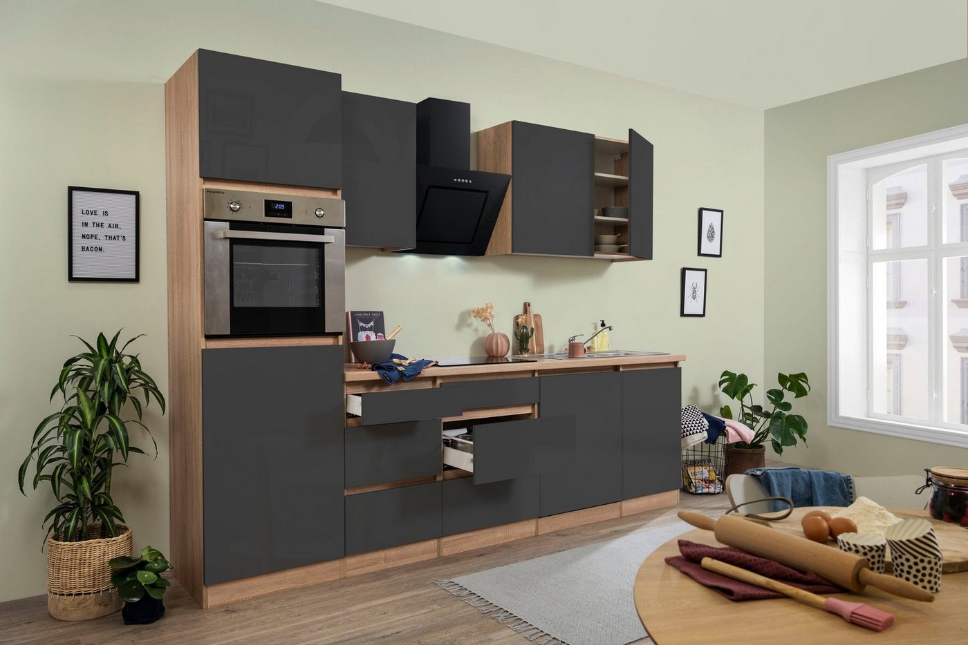 Die Küchenzeile »Boston« im modernen Design steht dir in zahlreichen Farb- und Dekorvarianten zur Verfügung. So kannst du deine Kücheneinrichtung auf das Raumambiente abstimmen. Die eingelassenen Griffleisten runden die Optik ab – ganz gleich, für welche Designvariante du dich entscheidest. Neben der Optik überzeugt der Küchenblock durch seine Konzeption: Der Spülen- sowie der Unterschrank und die Hängeschränke bieten ausreichend Stauraum für Geschirr, Kochutensilien und Vorräte. Im Lieferumfang enthalten sind zudem die wichtigsten Elektrogeräte enthalten. Dies meint Backofen, Kochfeld, Dunstabzugshaube sowie Kühlschrank und Geschirrspüler. Die praktische Soft-Close-Funktion der Türen erleichtern dir das Handling. Optisch ansprechend und clever durchdacht: die Küchenzeile »Boston« im modernen Design.