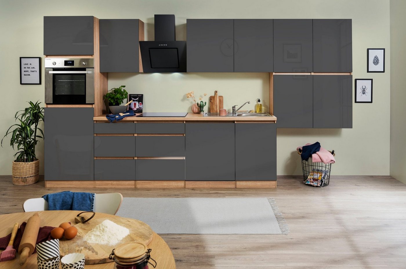 Eine praktische und zugleich optische Bereicherung stellt die Küchenzeile »Boston« mit E-Geräten der Marke HELD MÖBEL dar. Diese Einbauküche begeistert mit ihrem modernen Look. Eine ansprechende Besonderheit sind die eingelassenen Griffe, was der Küche zu einem besonderen Reiz verhilft. Da sie in verschiedenen attraktiven Farben zur Auswahl steht, passt sie wunderbar zur bereits bestehenden Einrichtung. In Sachen Ausstattung kann dieser Küchenblock überzeugen. Zum Set gehören alle Elektronikgeräte, die durch die passenden Umbauschränke komplettiert werden. Ausreichend Stauraum bieten Hängeschränke sowie Unterschränke. Komplettiert wird die Einbauküche durch eine passende Arbeitsplatte. Mit Stil und Funktionalität punktet die Küchenzeile »Boston« mit E-Geräten der Marke HELD MÖBEL.